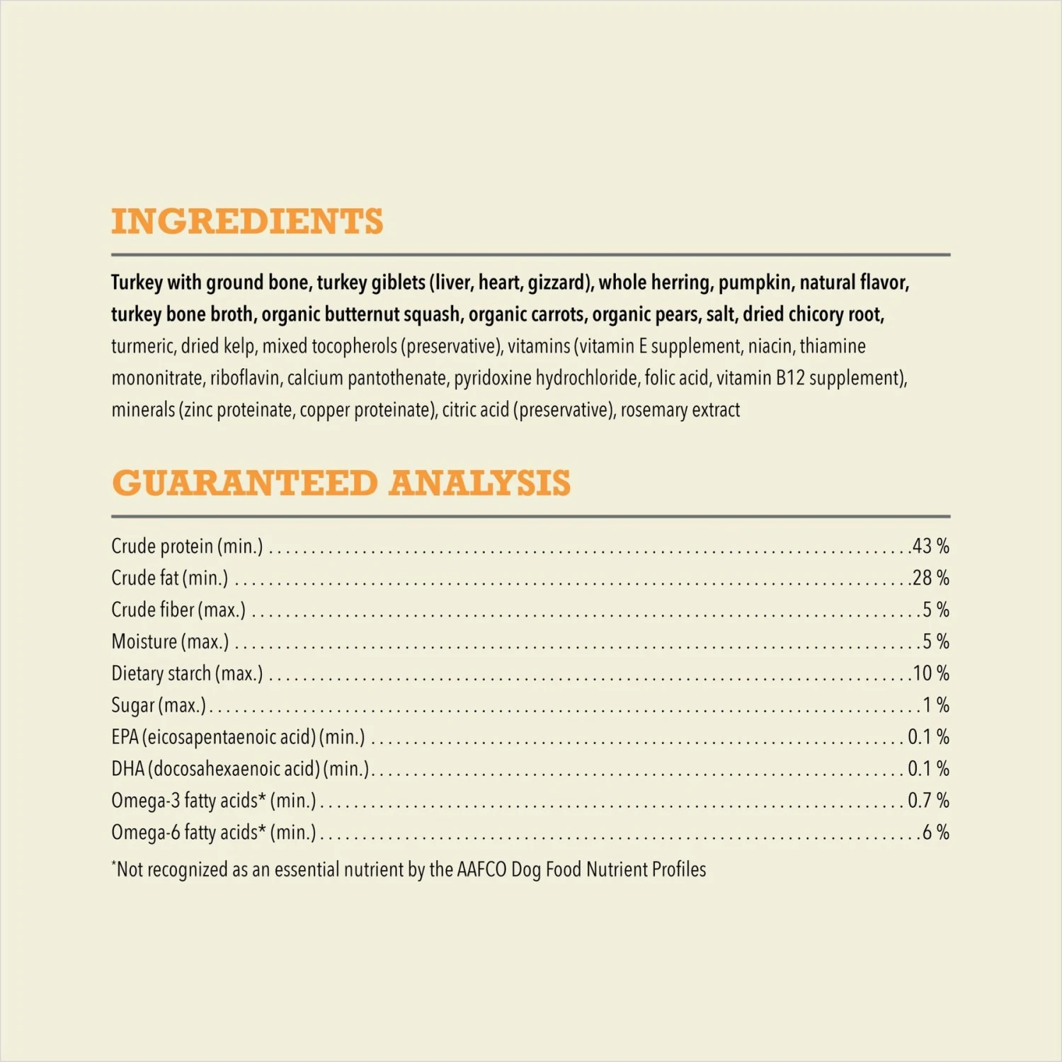 Feed your best friend’s wildest cravings with ACANA Freeze Dried Dog Food Meal & Topper, Grain Free, High Protein Free-Run Turkey Recipe. Made with delicious ingredients like free-run turkey, whole wild-caught herring, plus wholesome vegetables and fruit, it will satisfy your dog with every delectable bite. Freeze-drying helps lock in the ingredients’ naturally rich flavor and nutrients, while an infusion of tempting bone broth adds a taste your dog will crave. With all the benefits of raw nutrition in a convenient freeze-dried form, these bite-sized, breakable patties make feeding your bestie the best super easy. Simply mix with warm water for a nutritious high-protein meal, or crumble on top of your dog’s favorite food as a flavorful topper. Crafted with up to 90% quality animal ingredients, it’s a winning choice both you and your dog can feel good about!