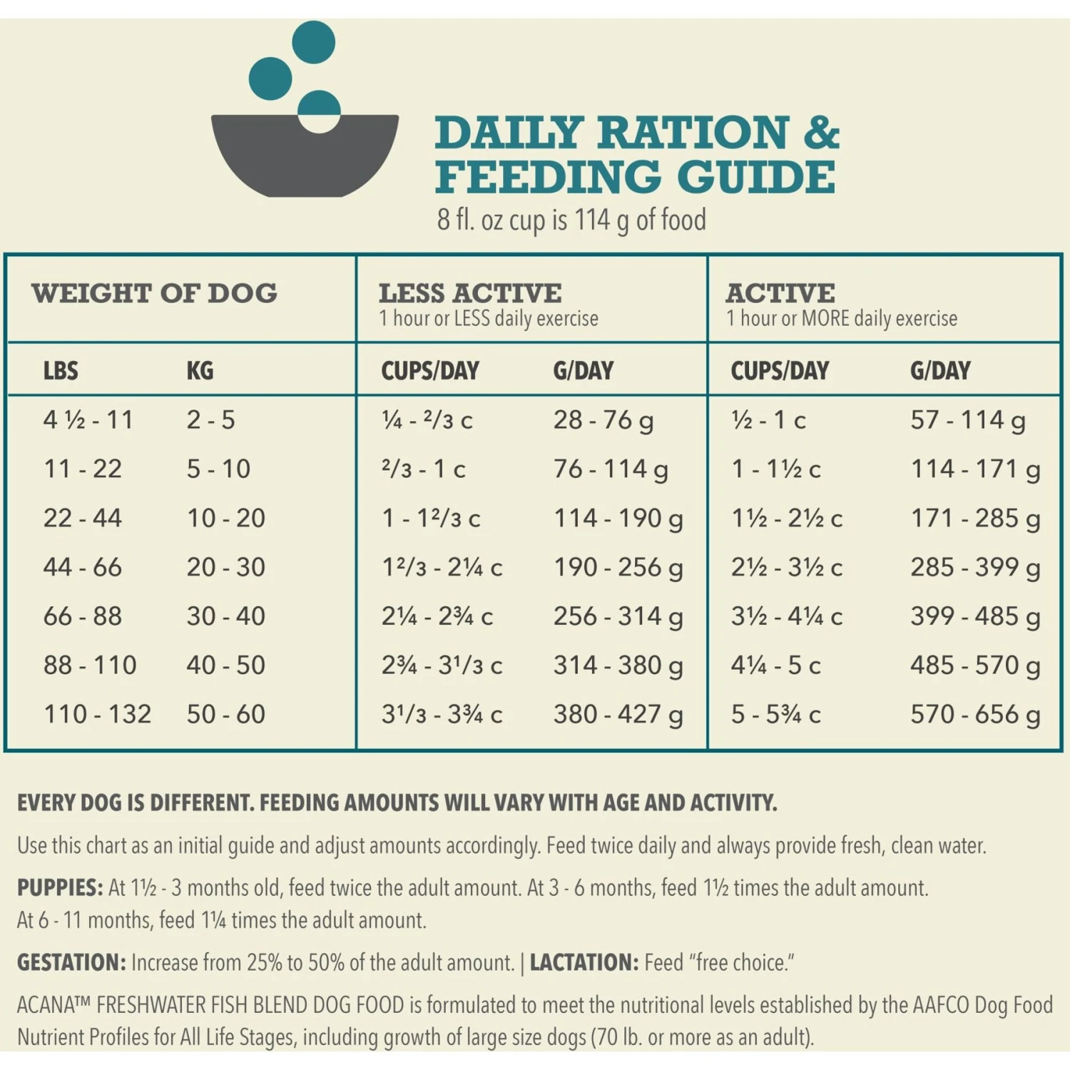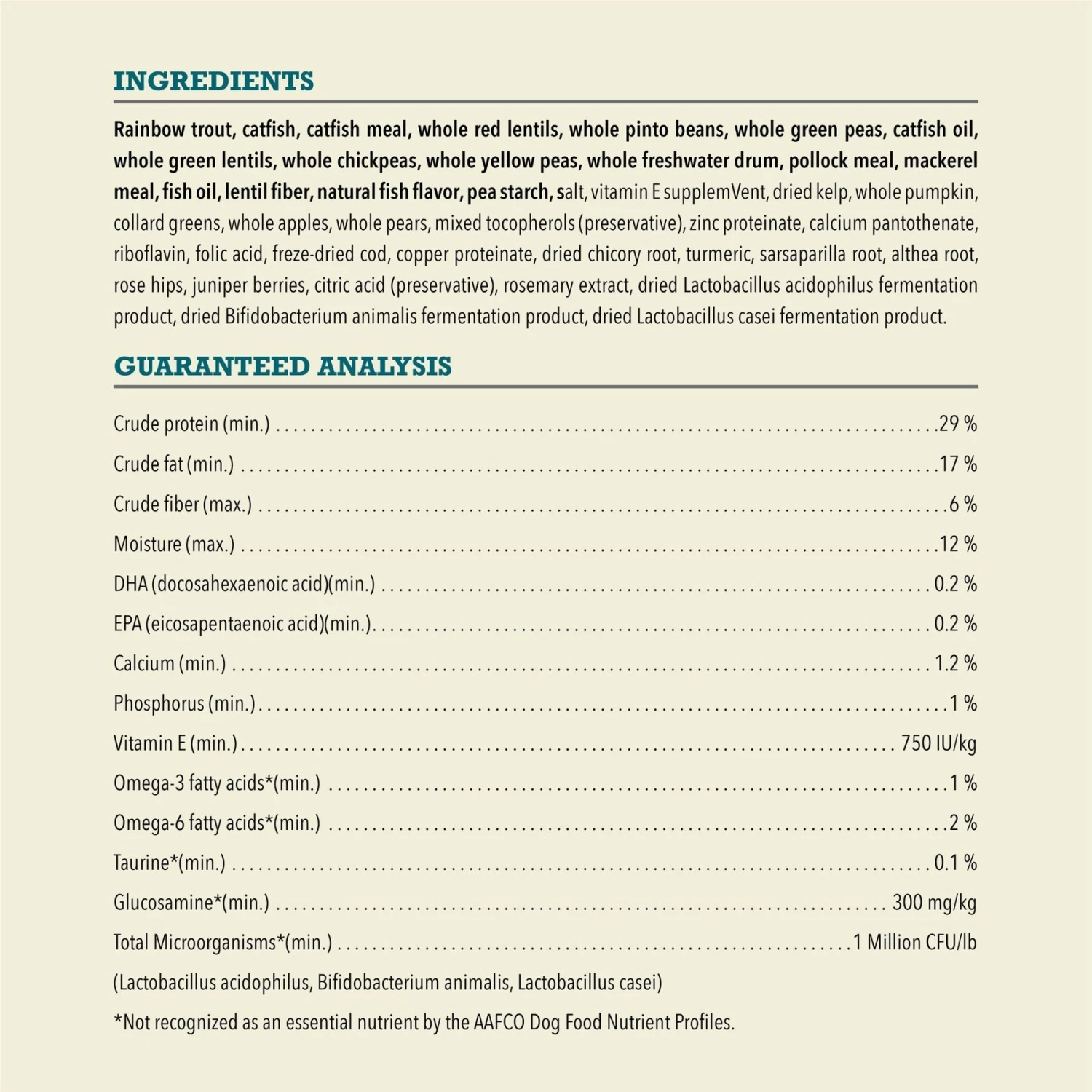 Bring home a dog food swimming with quality nutrition when you choose ACANA Grain Free Dry Dog Food, Freshwater Fish Recipe. Delicious and protein-rich raw rainbow trout, catfish & freshwater drum in this dog kibble are balanced with whole pumpkin, collard greens, apples and pears to create a delicious and nutritious meal for your pup. The grain-free kibble formula contains no soy, corn or wheat and includes added prebiotics and fiber to support your pal’s digestive health. Antioxidant-rich ingredients plus added vitamin E help support a healthy immune system, and an irresistible freeze-dried cod coating adds a current of tail-wagging flavor your buddy will love. With up to 60% quality animal ingredients and 40% fruits, vegetables and nutrients, it’s a river of flavor you can feel good about feeding your pup!