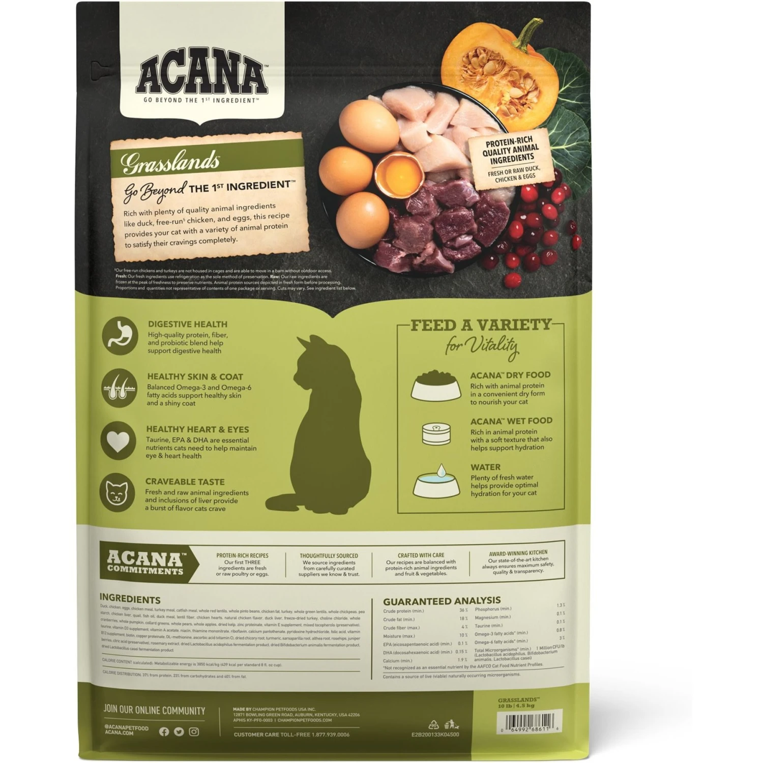 Feed your kitty carnivore’s wildest cravings with ACANA Highest Protein Grasslands Grain-Free Dry Cat Food, Duck, Free-Run Chicken and Eggs Recipe. This savory recipe starts with duck, free-run chicken and turkey, and eggs to satisfy your cat with every protein-rich bite. Made with up to 75% animal ingredients and never any soy, corn, tapioca or wheat, it’s a food you can feel good about feeding. Healthy fiber and a probiotic blend in the formula help support your kitty’s digestive health, while omega-3 and omega-6 fatty acids provide skin and coat support. With so much good stuff packed in and none of the bad, it’s a premium meal both you and your cat can feel good about!