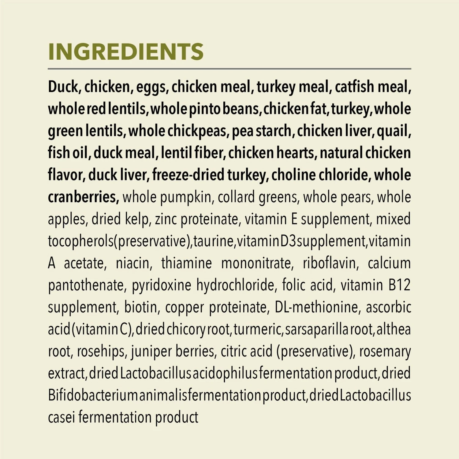 - This balanced, grain-free dry food recipe starts with duck, free-run chicken and turkey, and eggs for great taste and nutrition.