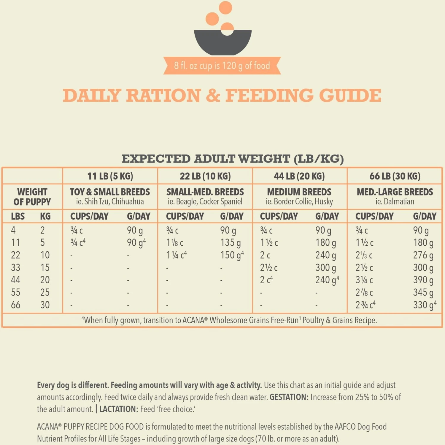 Help your puppy get a paw-some start to life with the ACANA Wholesome Grains Dry Dog Food. This recipe is made with free-run chicken, eggs, and free-run turkey. That’s paired with wholesome grains like oats, sorghum, and millet, which are high in fiber and gluten-free for digestive support. While this food is full of good stuff, it’s free of bad stuff like added artificial flavors, colors, or preservatives, and it contains no soy, corn, tapioca, or wheat ingredients. EPA and DHA from fish oil help support your furbaby’s developing brain, and this kibble contains protein and minerals from fresh or raw animal ingredients to support growing bones and muscle development.