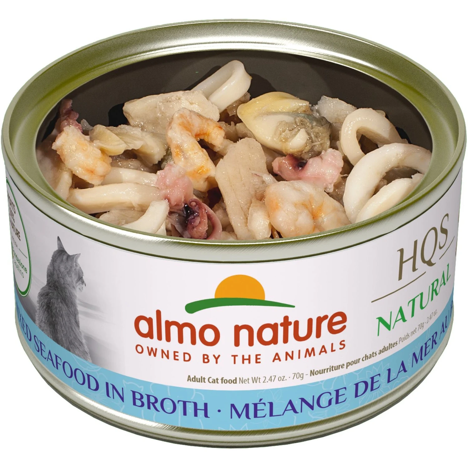 Almo Nature HQS Natural Mixed Seafood in broth Grain-Free Canned Cat Food delivers the simplicity and authenticity that cats adore: real, all-natural pieces of mixed seafood as the first ingredient, cooked in minimal water to create a moist, tasty broth. Free of preservatives and additives, and a naturally rich source of highly digestible proteins (min. 13%), essential amino acids and micronutrients, it’s a nourishing and delicious meal that’s sure to appeal to your companion’s inner wild cat. Keep finicky felines enticed by rotating between the wide array of flavorful HQS Natural recipes! And you’ll be happy to know that every healthy bite is crafted with HQS (High Quality Sourced) ingredients—meat and fish that was originally fit for human consumption and is now solely used for pet food to help nourish your furry friend!