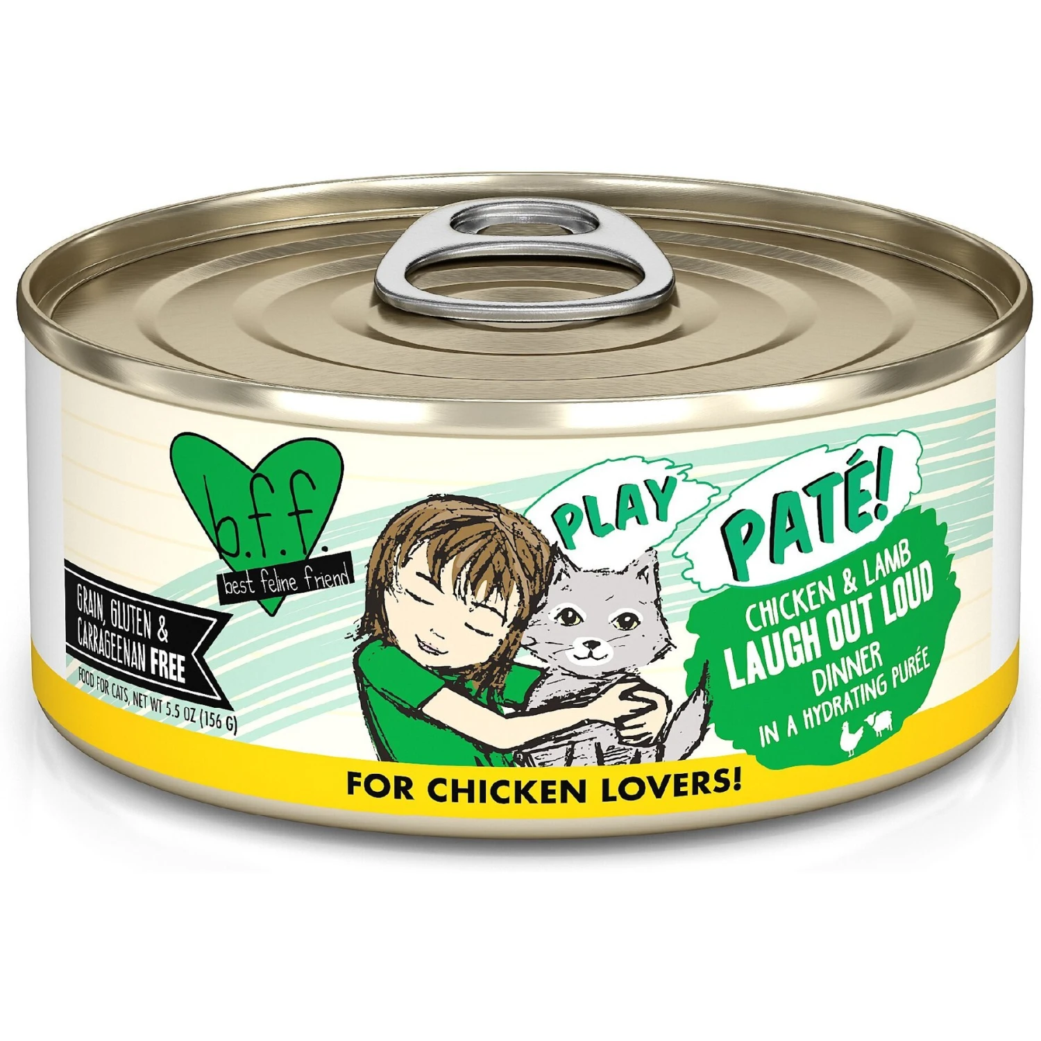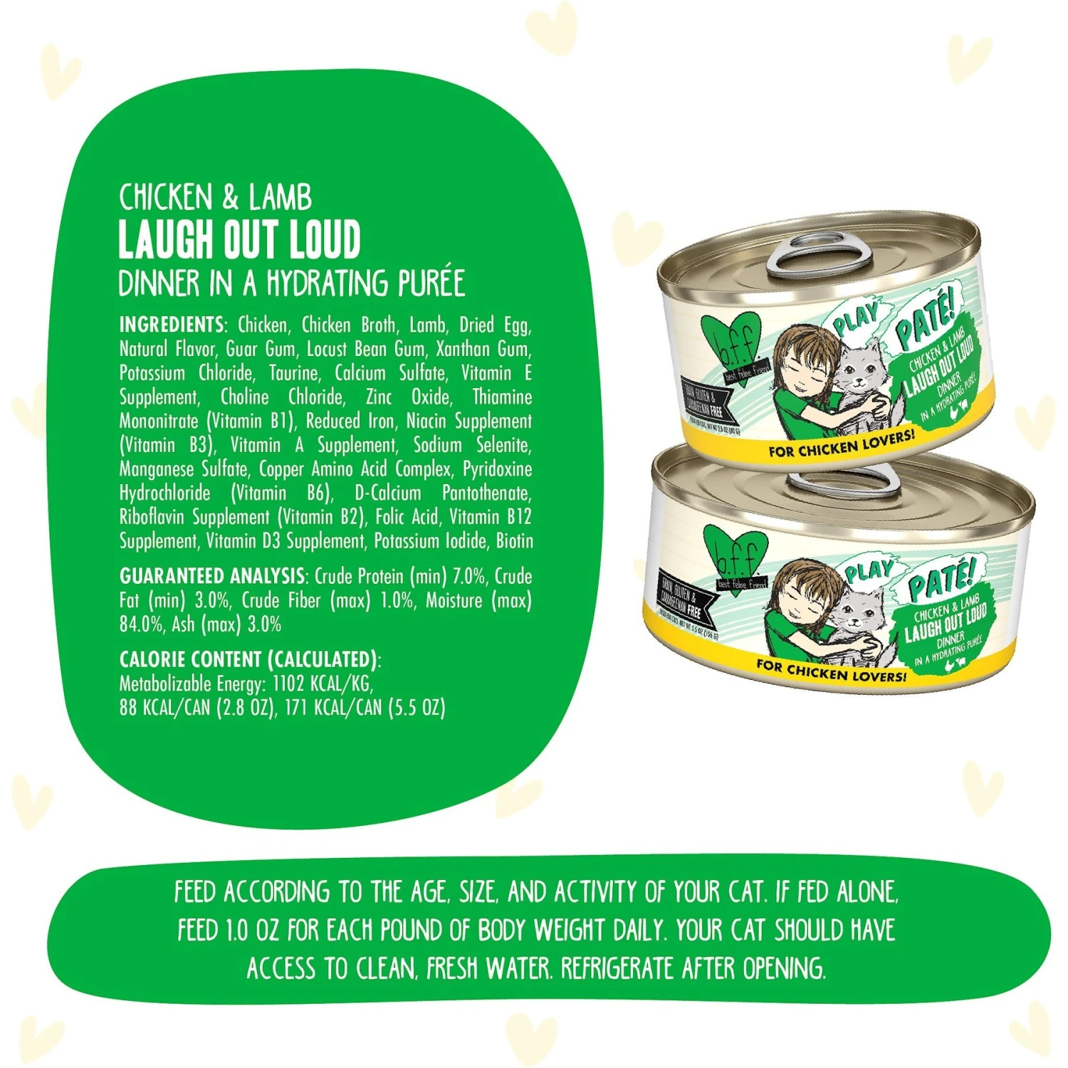 Be ready to LOL at your kitty’s enthusiastic reaction to BFF Play’s Pate Lovers Chicken & Lamb Laugh Out Loud Wet Cat Food. It’s pureed to purr-fection and made with only simple, wholesome ingredients. He’ll find the taste and texture paw-fect, while you’ll appreciate it’s the whole kitten-caboodle with 82% moisture content that helps keep him hydrated. BFF knows what’s left out is just as important as what’s in the recipe, so there are no grains, gluten, carrageenan, MSG, artificial flavors, artificial colors or BPA. Plus, there are plenty of irresistible flavor options so you can switch up the menu and find your kitty’s fur-avorite.