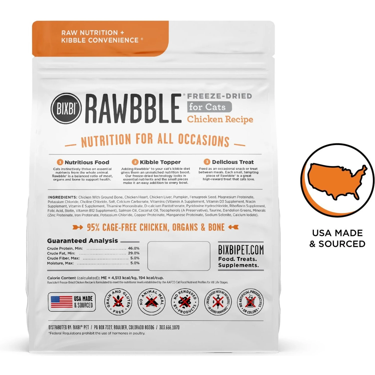 Feed your feline friend a meal that’s delicious and nutritious with Bixbi RAWBBLE Chicken Recipe Grain-Free Freeze-Dried Cat Food! This purr-worthy recipe combines whole animal nutrients from raw food with the convenience of kibble. It is crafted with 95% meat, organs and bones to purr-vide your cat companion with a healthy source of protein and to help promote healthy teeth and gums. Formulated using freeze-dried technology, RAWBBLE locks more naturally sourced essential nutrients in every delicious bite!