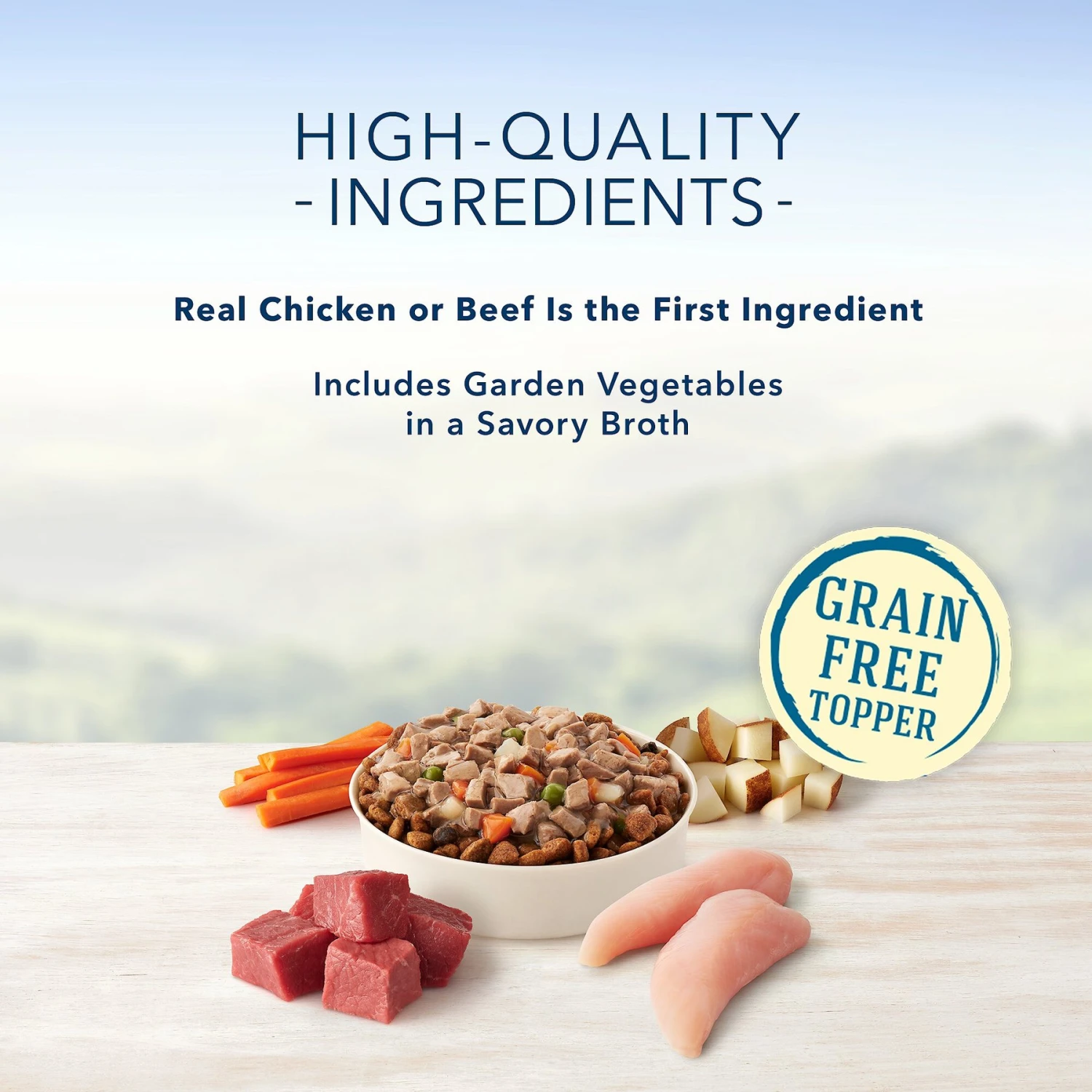 Take your doggo’s dinner up a notch with Blue Buffalo Delectables Grain Free Natural Wet Dog Food Topper. Paw-fect for puppers of all sizes, this irresistibly tasty wet food topper is made using only the finest natural ingredients and packaged in a handy, single-serve pouch. It starts with high-quality protein from tender chunks of chicken or beef steeped in a savory broth, packed with nutritious veggies, then enhanced with vitamins and minerals. A flavorful addition to your furry friend’s next meal, this dog food topper does not contain any by-product meals, corn, wheat, soy, artificial flavors or preservatives.