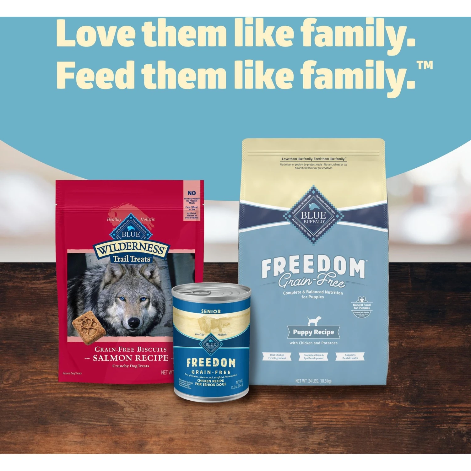 Is your puppy sensitive to certain ingredients? Then feed him Blue Buffalo’s Freedom Puppy Chicken Recipe Grain-Free Dry Dog Food! This delicious, 100% grain-free and gluten-free kibble features real chicken first and is completely free from poultry by-product meals, corn, wheat, soy and artificial flavors and preservatives. And since it’s specially designed for puppies, the kibble is sized smaller and it contains DHA and ARA—these fatty acids are found in mother’s milk and help support brain and eye development. It also includes BLUE’s exclusive LifeSource Bits—a combination of selected antioxidants, minerals and vitamins picked by veterinarians and animal nutritionists to support your pup’s overall health and wellness. Now your paw-tner really has something to wag his tail about!