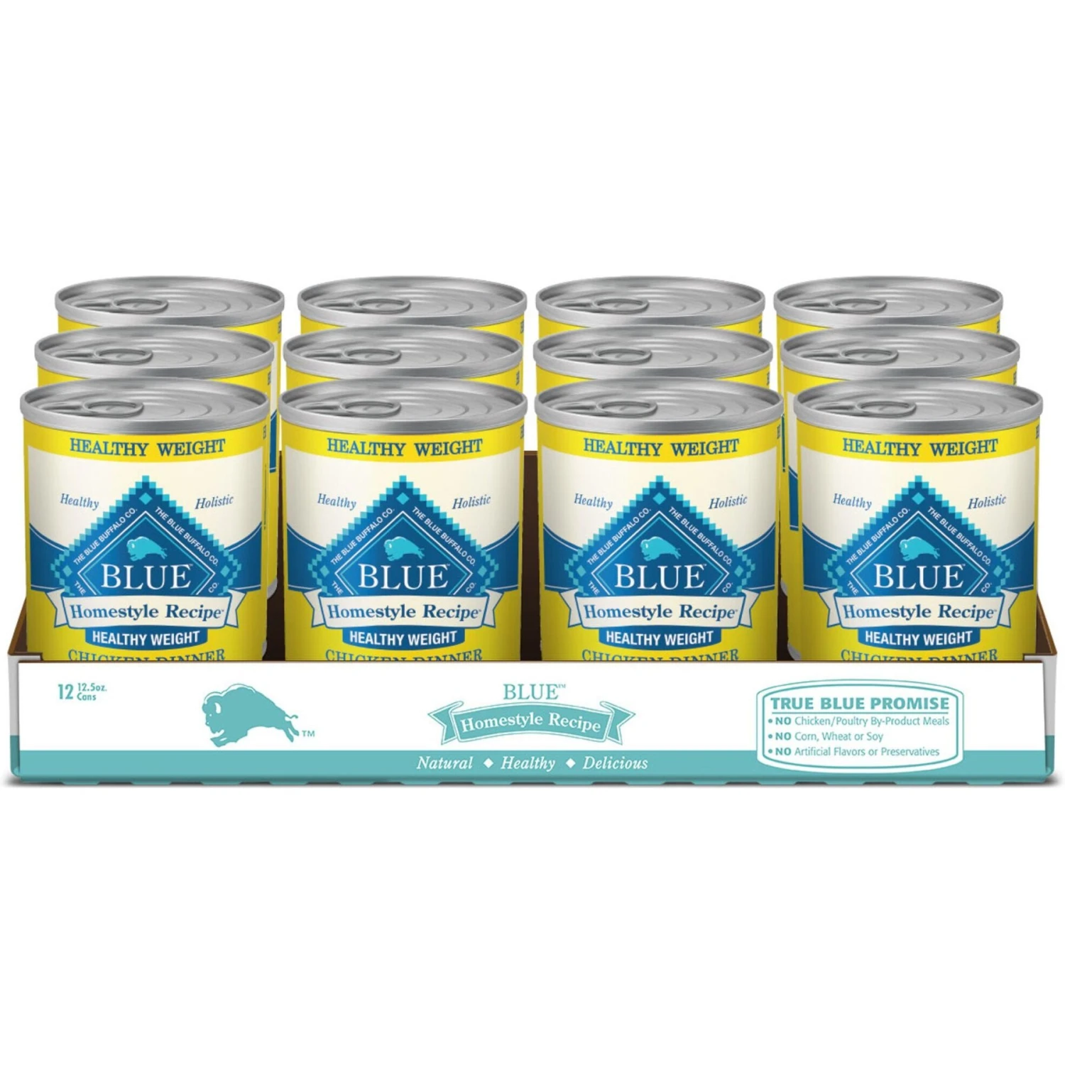 Blue Buffalo Homestyle Recipe Healthy Weight Chicken Dinner with Garden Vegetables & Brown Rice Canned Dog Food, 12.5-oz, case of 12—Help keep Fido feeling fit with Blue Buffalo Homestyle Recipe Natural Adult Healthy Weight Wet Dog Food. Paw-fect for your furry friend, this irresistibly tasty wet food is made using only the finest natural ingredients. It starts with high-quality protein from tender chunks of chicken steeped in a hearty gravy, then it’s packed with garden fruits and veggies and enhanced with vitamins and minerals. Formulated with reduced calories from fat to support healthy weight management, this pate-style dog food is made with wholesome ingredients that do not contain any by-product meals, corn, wheat, soy, artificial flavors or preservatives.