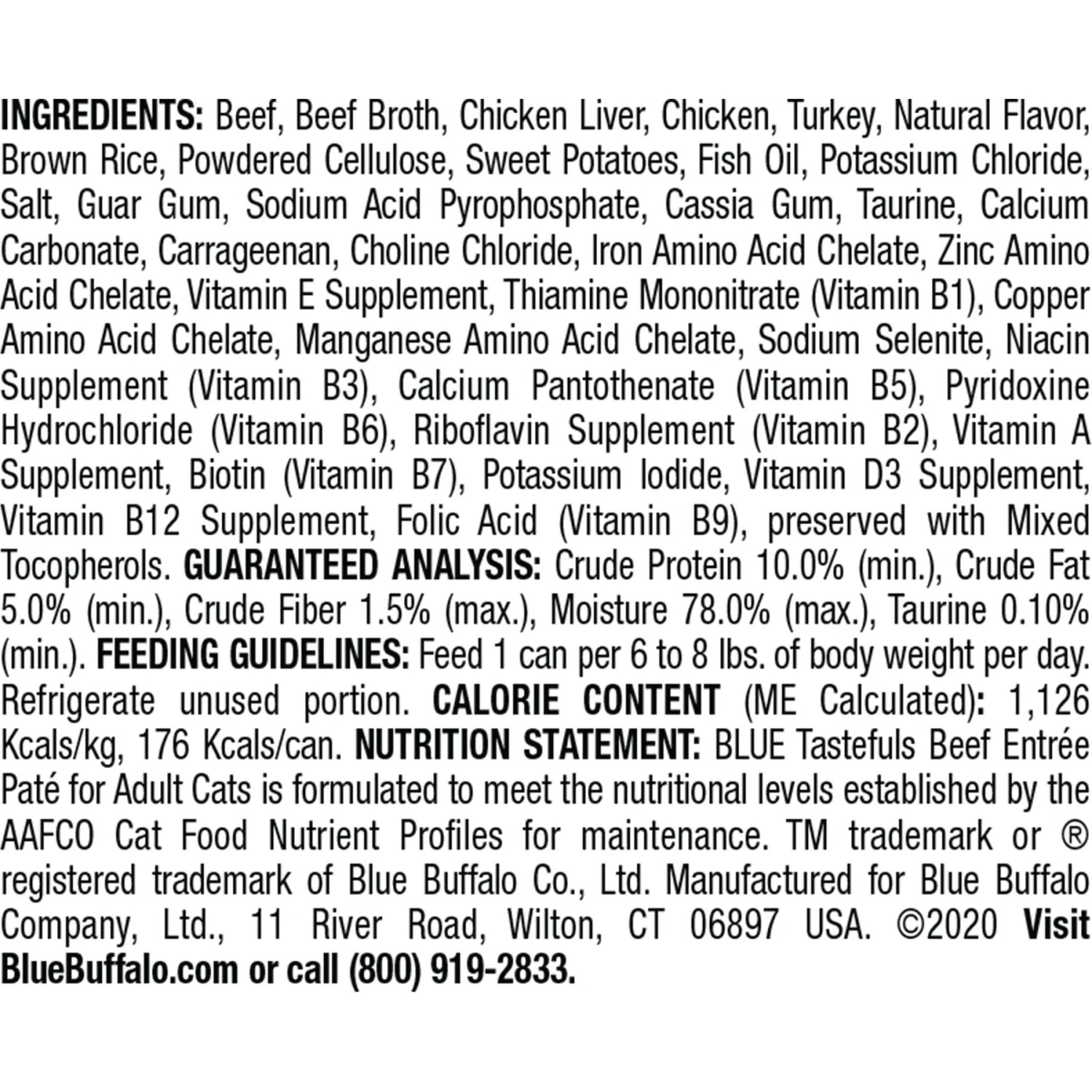 The Blue Buffalo Tastefuls Natural Pate Beef Entree Wet Cat Food features real beef as the first ingredient. Wholesome brown rice and sweet potatoes also make up this silky-smooth pate. The recipe is enhanced with vitamins, minerals and other nutrients, so it has the great taste your kitty wants and the healthy ingredients that you prefer to feed. Its high moisture content can even help your furbaby to stay hydrated.