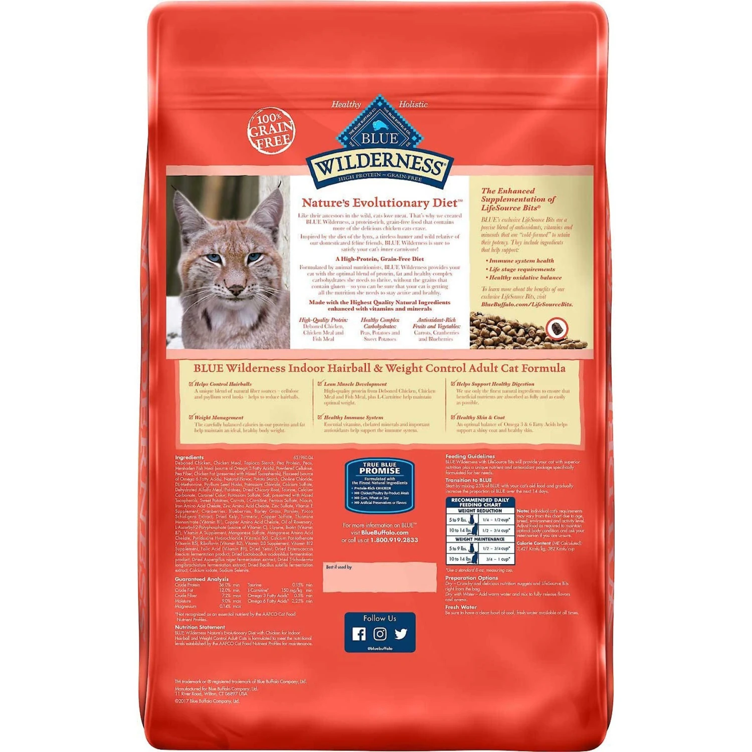 Feed your kitty’s wild side! Each purchase comes with Blue Buffalo Wilderness Indoor Hairball & Weight Control Chicken Recipe Grain-Free Dry Cat Food, 11-lb bag & Blue Buffalo Bursts With Savory Seafood Cat Treats, 12-oz tub. Blue Buffalo Wilderness Indoor Hairball & Weight Control Chicken Recipe Grain-Free Dry Cat Food is made with real chicken as the first ingredient and never any grains, gluten, wheat or by-products. It packs a powerful protein punch to support your little hunter’s wild pursuits in every bowl, without the extra calories. It’s loaded with antioxidant-rich LifeSource Bits―a unique blend of vitamins, minerals and superfoods to support immunity―plus omegas for a healthy skin and coat, taurine for vision and heart health, and essential amino acids to fuel all those indoor adventures. Plus, it helps maintain healthy digestion and prevent hairballs with a unique fiber blend in every bite. Blue Buffalo Bursts With Savory Seafood Cat Treats are crunchy on the outside and creamy on the inside, with a bold flavor that will have her grinning like the cat that got the canary. Real seafood is the first ingredient – because your savvy tabby can tell when something’s fishy, and she’ll accept no imitations!