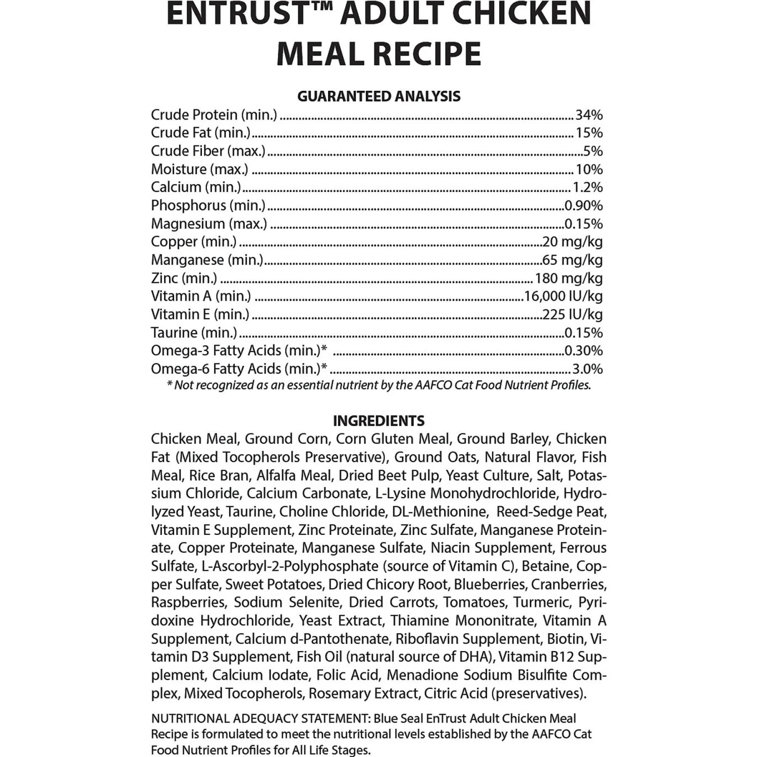 Kittens: Start kittens on Blue Seal EnTrust between three and five weeks of age. If preferred, moisten with equal parts of milk or water. Kittens will eat approximately every four hours. Feed them all they want. At four to five months of age, they may be gradually changed to two feedings per day. Adult Cats: The Suggested Feeding Guidelines are intended solely as a guide. The variables of management, environment and breed may dictate changes in the animal’s requirements. Food consumption can be inconsistent during gestation. Feed enough to keep proper body condition and body weight. Food consumption can be inconsistent during lactation. Feed at two to three times the normal amount of food and adjust to maintain proper weight. Introducing a New Food: To avoid dietary upset when introducing your pet to a new food, switch to the new food over the course of a week by gradually decreasing the old food and increasing the new. Provide plenty of clean, fresh water at all times.