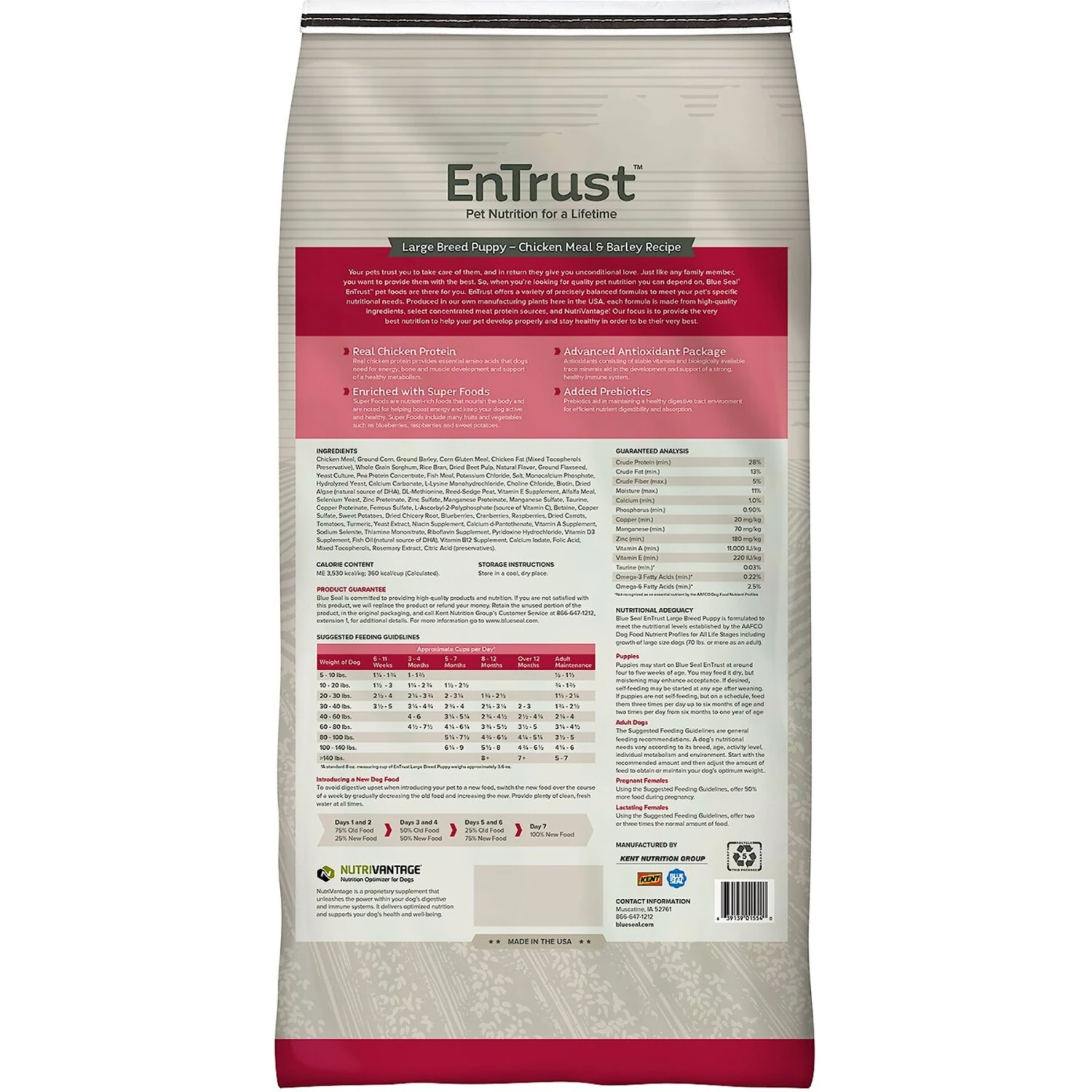 Blue Seal EnTrust Large Breed Puppy Chicken Meal & Barley Recipe Dry Dog Food is specifically formulated for the growing large breed puppy in your life, including puppies with lower caloric requirements. Targeted protein and fat levels support your pooch’s optimum growth and development, while omega-3 fatty acids help develop his brain function. This formula is also paw-fect for meeting the demanding nutritional needs of pregnant and nursing dogs.