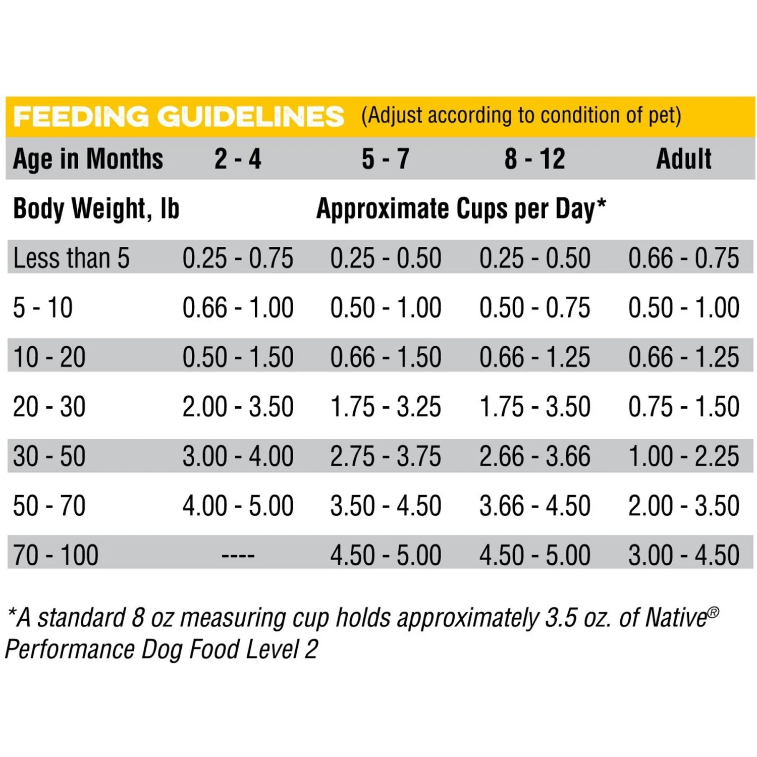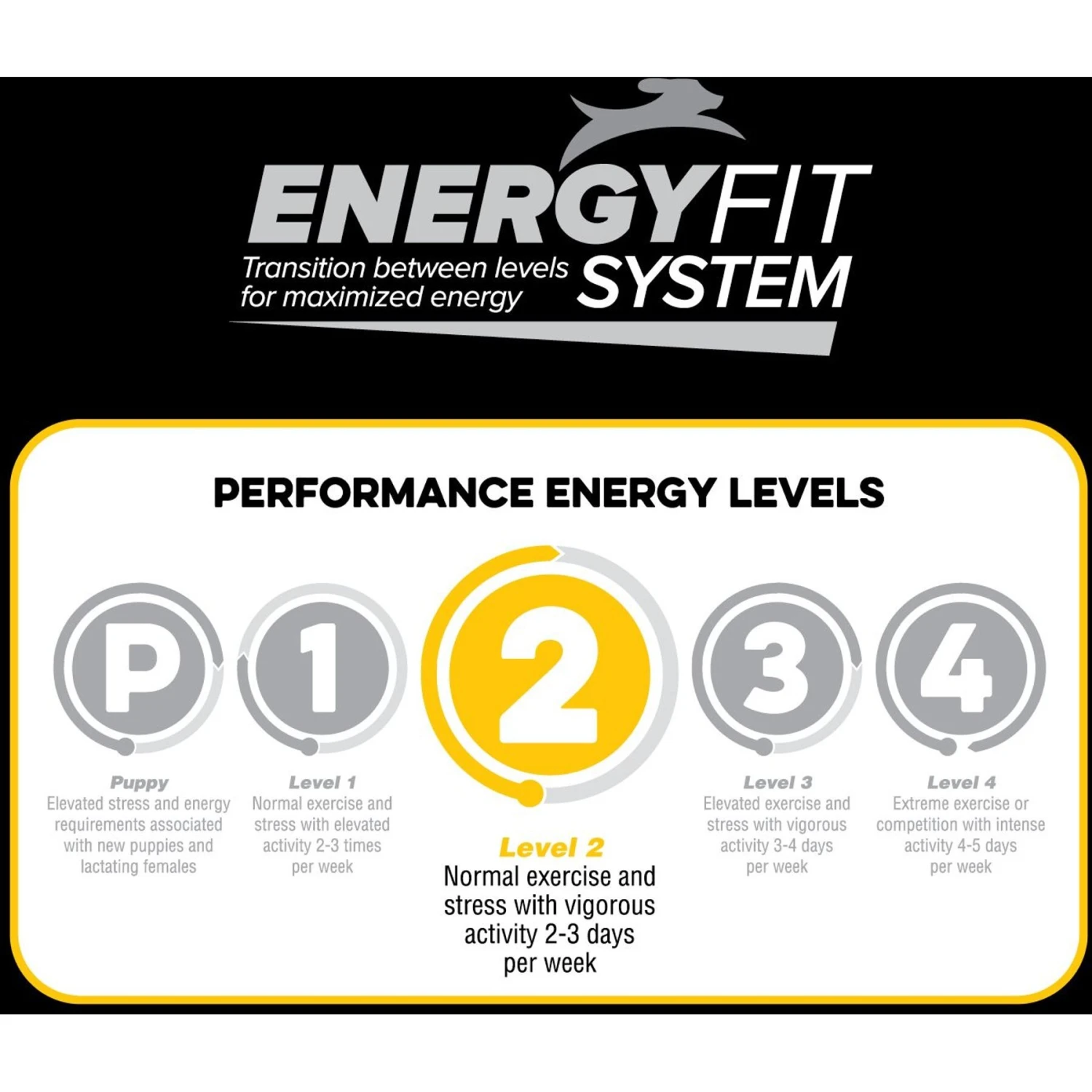 - Recommended for performance canines with moderate activity levels and periods of vigorous activity or for those that may have difficulty maintaining weight with regular exercise—it’s also suitable for puppies and pregnant or lactating females with low to normal energy needs.