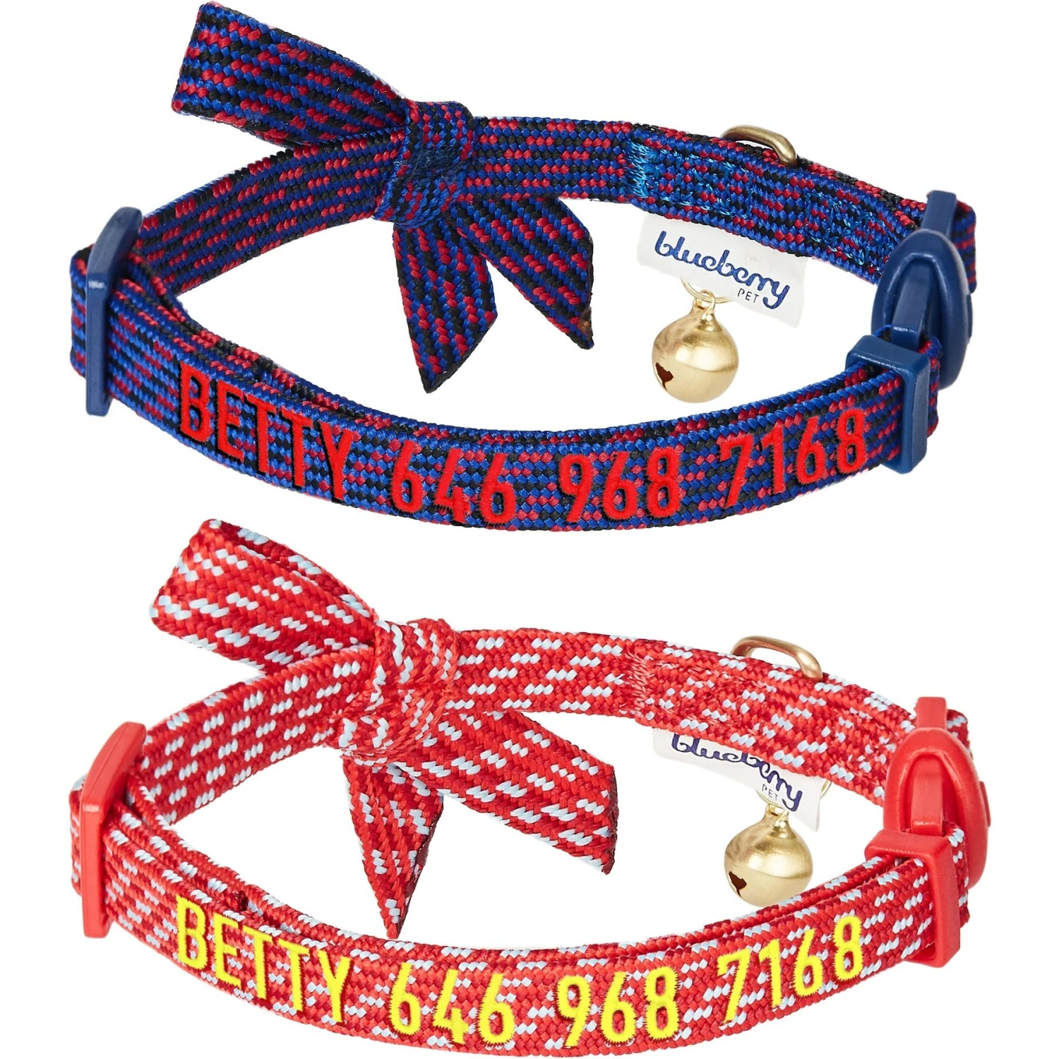 Remember to measure your pet for the paw-fect fit. Your feline will be strutting down the catwalk with the Blueberry Pet Sleek Handsome Diagonal Striped Breakaway Bow Tie Personalized Cat Collar. These are a fur-tastic way to keep a collar securely around your cat’s neck with a cute removable bowtie, sturdy webbing, a breakaway clasp, and a pop of pizzazz—plus, it’s adorned with an adorable fish charm! All it takes is the personalized touch of your kitty’s name and phone number to make your walk that much better. Your choice of embroidery thread color will make even more of a fun, unique difference!
