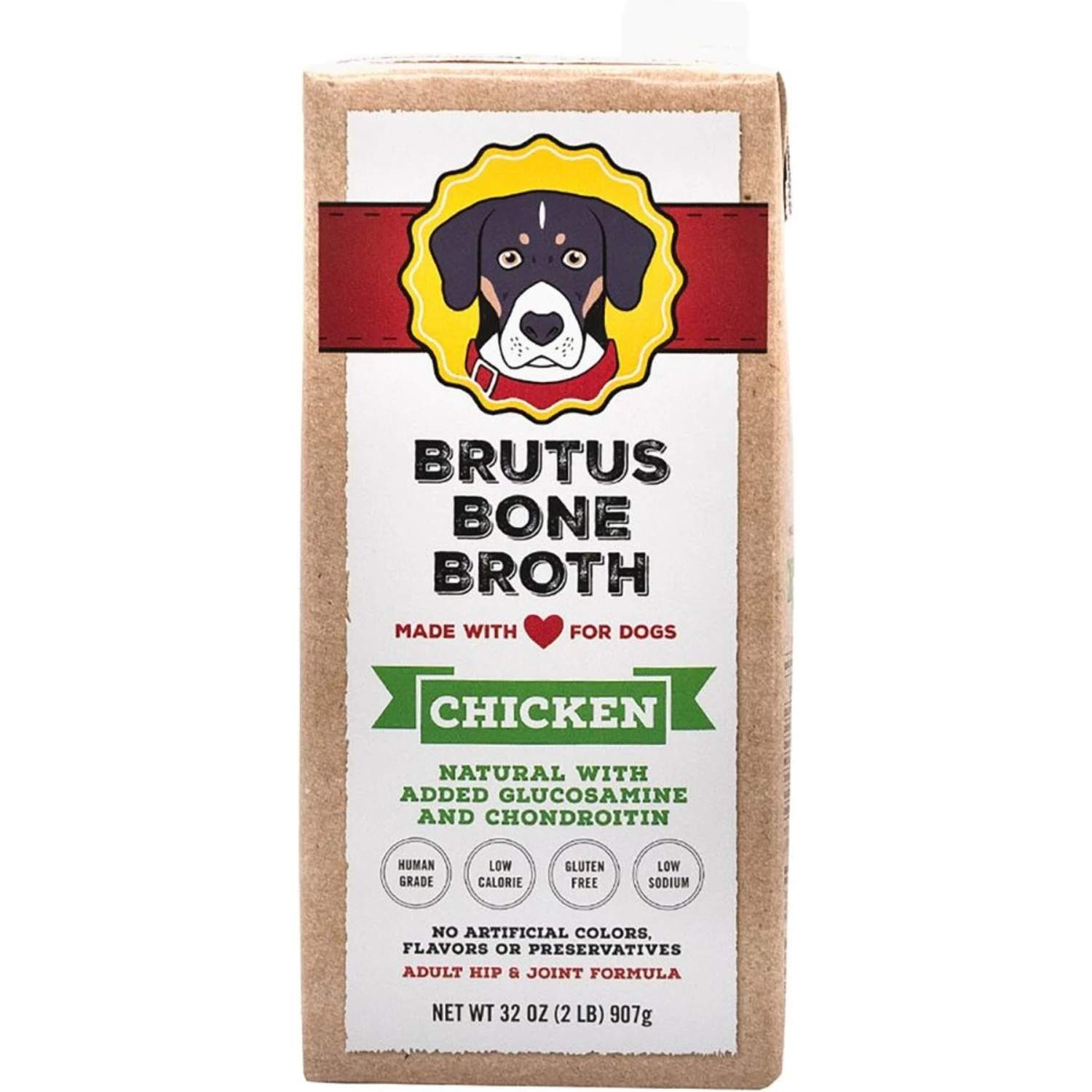 Brutus Broth Bone Broth Chicken Flavor Hip & Joint Human-Grade Dog Food Topper, 32-oz box—Add flavor, nutrients and moisture to your dog’s diet with Brutus Broth Bone Broth Chicken Flavor Hip & Joint Formula Dog Food Topper! This delectable bone broth is 100% natural, human grade and fortified with turmeric for inflammation, along with glucosamine and chondroitin to support healthy hips and joints. Bone broth is also packed with minerals, nutrients and amino acids to support your dog’s digestive health and his immune system. It’s non-GMO, dairy-free, soy-free, gluten-free and low in fat and sodium. Plus, it’s made without artificial colors, flavors or preservatives. Serve this highly digestible broth it on its own, in liquid form or as a frozen treat, or add it to your dog’s kibble or wet food!