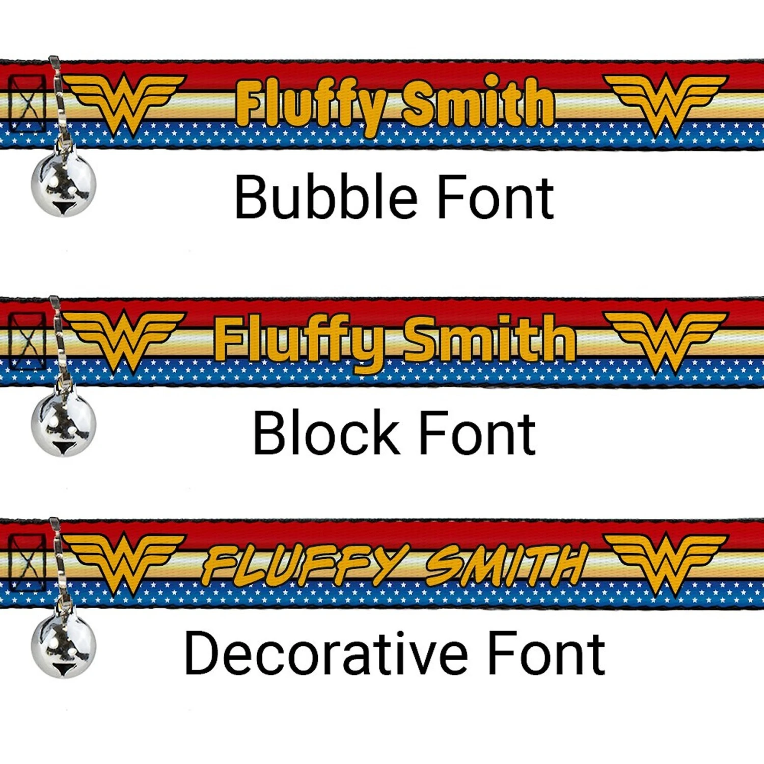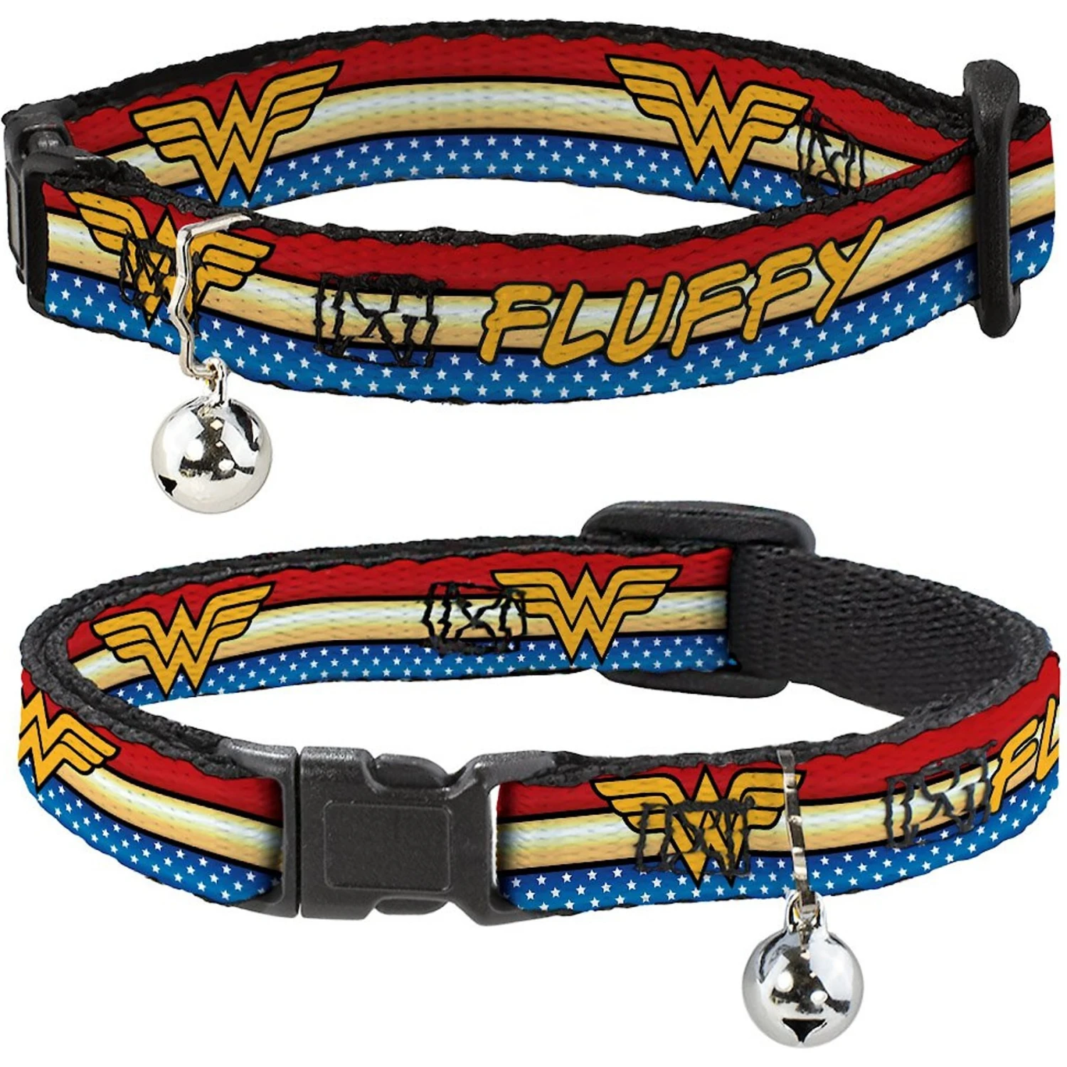 Turn your gal pal into a superhero with the Buckle-Down Personalized DC Comics Wonder Woman Breakaway Cat Collar with Bell. This breakaway collar for cats features bold and vibrant original artwork and can be personalized with printed text just for your pal. It is handcrafted in the USA with high-density polyester that’s designed for long-lasting durability. This breakaway cat collar is equipped with an over-engineered plastic buckle and a super-strong D-ring to keep your sidekick secure.