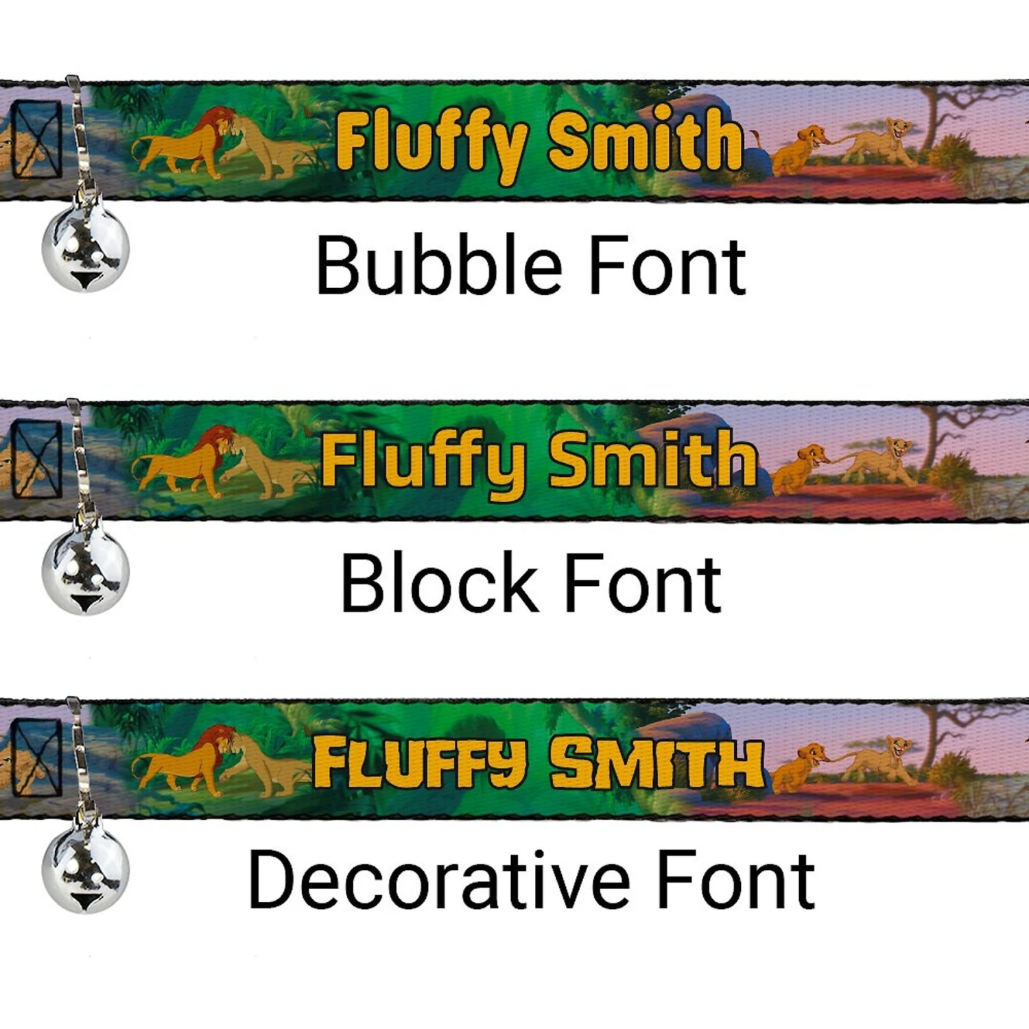 The Buckle-Down Personalized Lion King Simba & Nala Breakaway Cat Collar makes a purr-worthy, colorful accessory for your feline friend! This collar features a high-density polyester build and sturdy, plastic buckle for increased durability. Its’ fun Lion King design adds a touch of Disney flair to your companion’s everyday look. On top of that, the collar can also be customized with your own text like your cat’s name or a fun message.