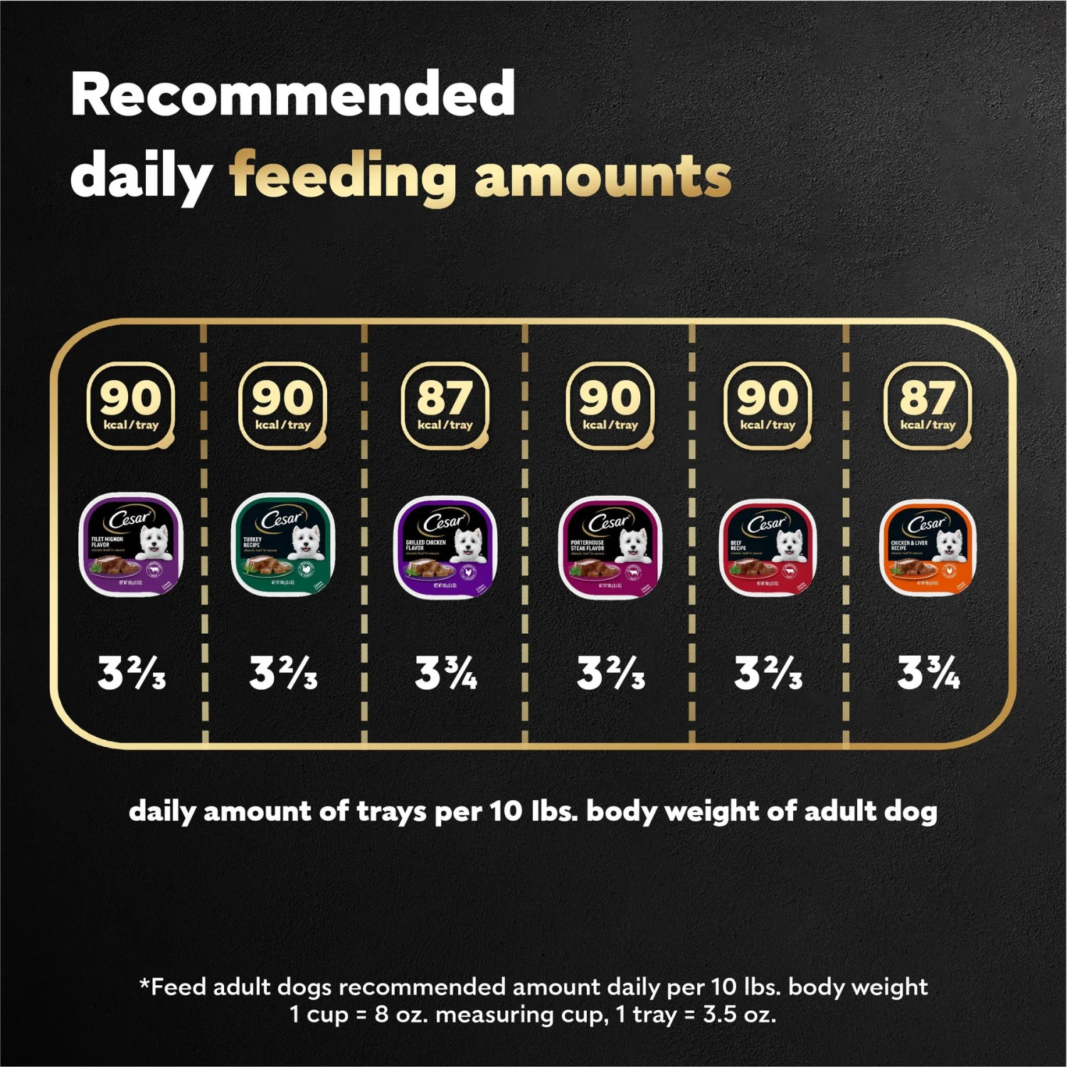 Show your canine companion your love by feeding him gourmet meals formulated to keep him happy and healthy. The Cesar Wet Dog Food Classic Loaf in Sauce Grilled Chicken, Filet Mignon, Porterhouse Steak, Beef, Chicken & Liver and Turkey Variety Pack features six delicious recipes made with real meat as the number one ingredient. They’re crafted in the USA using fine ingredients from around the world and contain no fillers, artificial flavors, or grains (although trace amounts may be present due to cross-contact during manufacturing). Plus, each gourmet soft dog food is served in a convenient tray with an easy, peel-away seal. Thanks to Cesar, you can give your best bud hearty meals that he’ll love and love you for! This variety pack includes the following recipes—Grilled Chicken Flavor, Filet Mignon Flavor, Porterhouse Steak Flavor, Beef Recipe, Chicken & Liver Recipe, and Turkey Recipe.