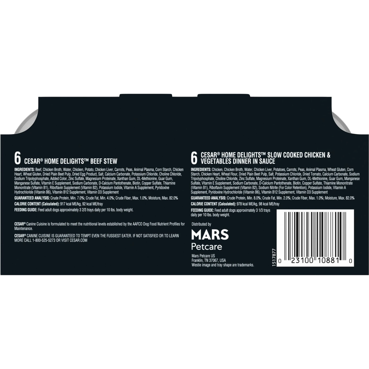 Show your canine companion your love by feeding her gourmet meals formulated to keep her happy and healthy. The Cesar Home Delights Slow Cooked Chicken & Vegetables Dinner and Beef Stew Adult Wet Dog Food variety pack features two delicious recipes made with real chicken or beef as the number one ingredient. They’re crafted in the USA using fine ingredients from around the world and contain no fillers or artificial flavors. Plus, each gourmet soft dog food is served in a convenient tray with an easy, peel-away seal. Thanks to Cesar, you can give your BFF hearty meals she’ll love and love you for! This variety pack includes the following recipes—Slow Cooked Chicken & Vegetables Dinner in Sauce and Beef Stew.