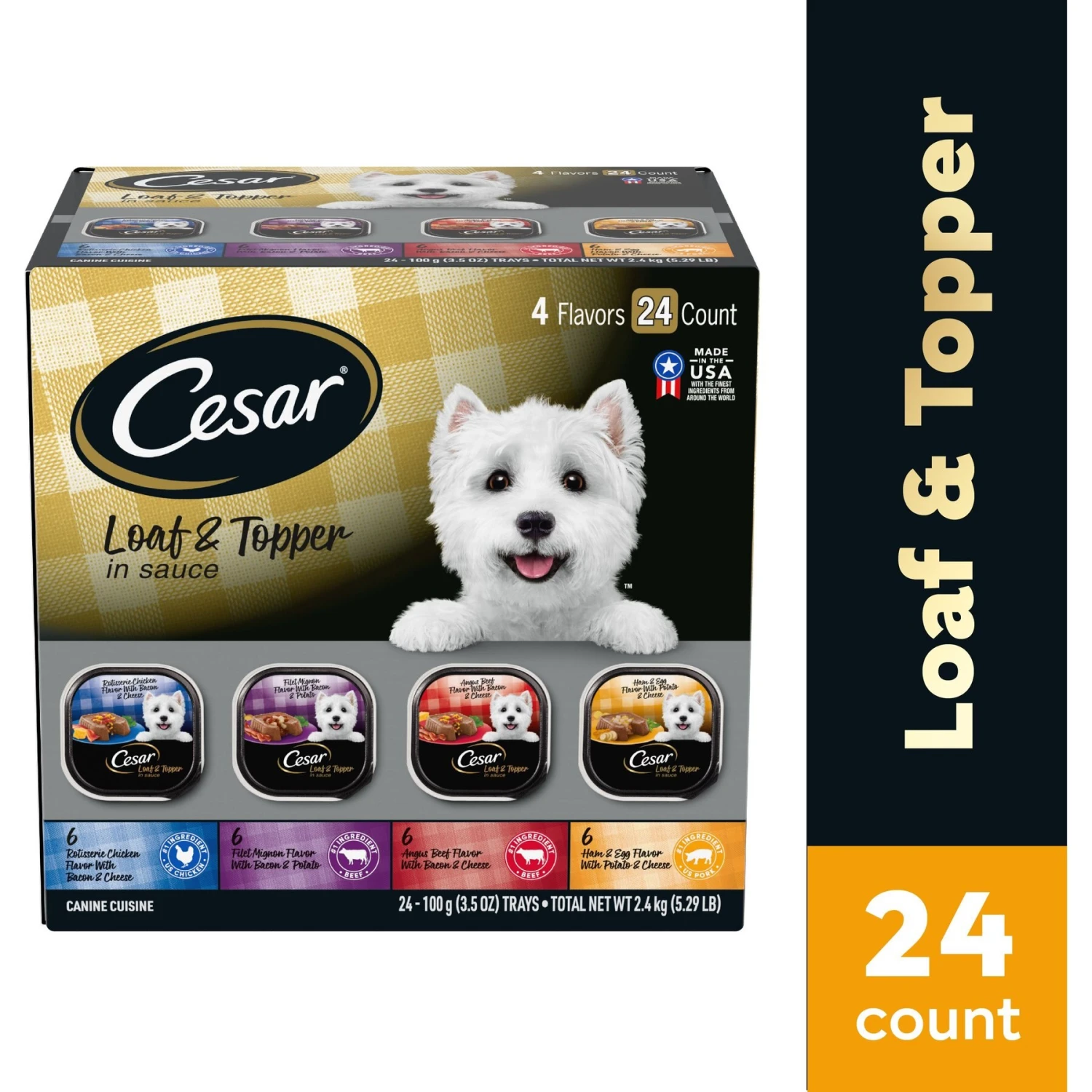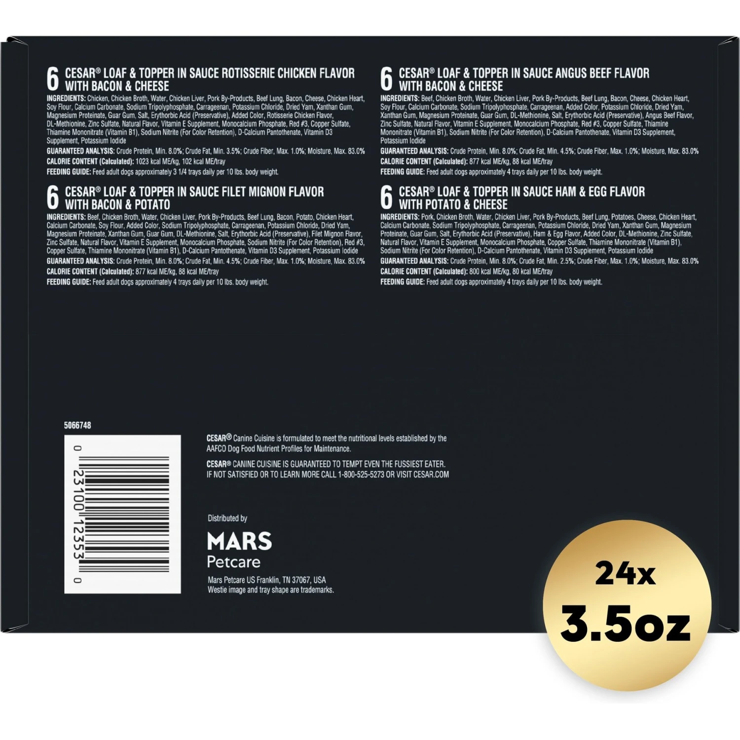 Show your canine companion your love by feeding him gourmet meals formulated to keep him happy and healthy. The Cesar Wet Dog Food Classic Loaf in Sauce Rotisserie Chicken, Filet Mignon, Angus Beef, and Ham & Egg Flavors Variety Pack features four delicious recipes made with real chicken, beef, or pork as the number one ingredient. They’re crafted in the USA using fine ingredients from around the world and contain no fillers, artificial flavors, or grains (although trace amounts may be present due to cross-contact during manufacturing). Plus, each gourmet soft dog food is served in a convenient tray with an easy, peel-away seal. Thanks to Cesar, you can give your best bud hearty meals that he’ll love and love you for! This variety pack includes the following recipes—Rotisserie Chicken Flavor with Bacon & Cheese, Filet Mignon Flavor with Bacon & Potato, Angus Beef Flavor with Bacon & Cheese, and Ham & Egg Flavor with Potato & Cheese.