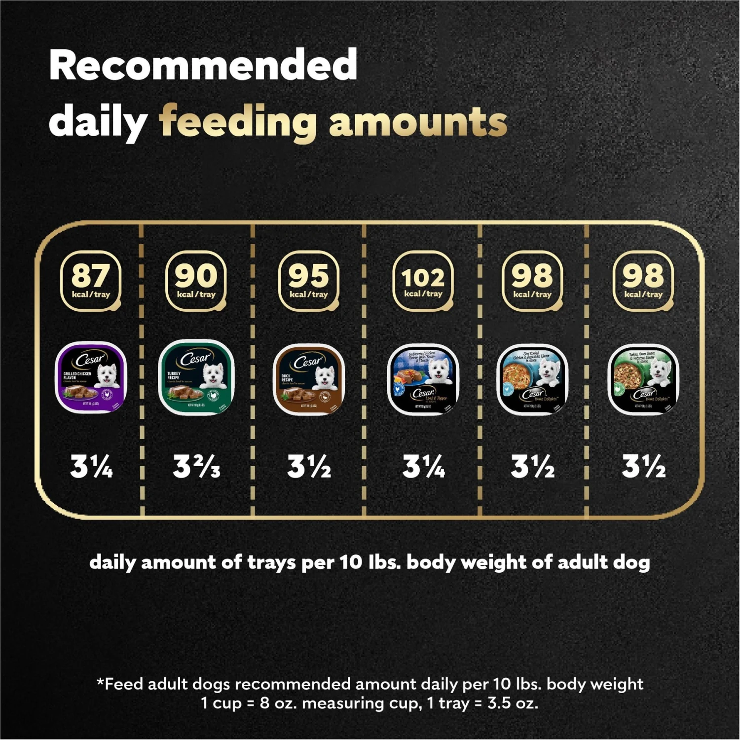 Show your canine companion your love by feeding him gourmet meals formulated to keep him happy and healthy. The Cesar Wet Dog Food Poultry Lovers Variety Pack with Real Chicken, Turkey, or Duck features six delicious recipes made with real poultry as the number one ingredient. They’re crafted in the USA using fine ingredients from around the world, and contain no fillers, artificial flavors, or grains (although trace amounts may be present due to cross-contact during manufacturing). Plus, each gourmet soft dog food is served in a convenient tray with an easy, peel-away seal. Thanks to Cesar, you can give your best bud hearty meals that he’ll love and love you for! This variety pack includes the following recipes—Grilled Chicken Flavor, Turkey Recipe, Duck Recipe, Rotisserie Chicken Flavor with Bacon & Cheese, Slow Cooked Chicken & Vegetables Dinner, and Turkey, Green Beans & Potatoes.