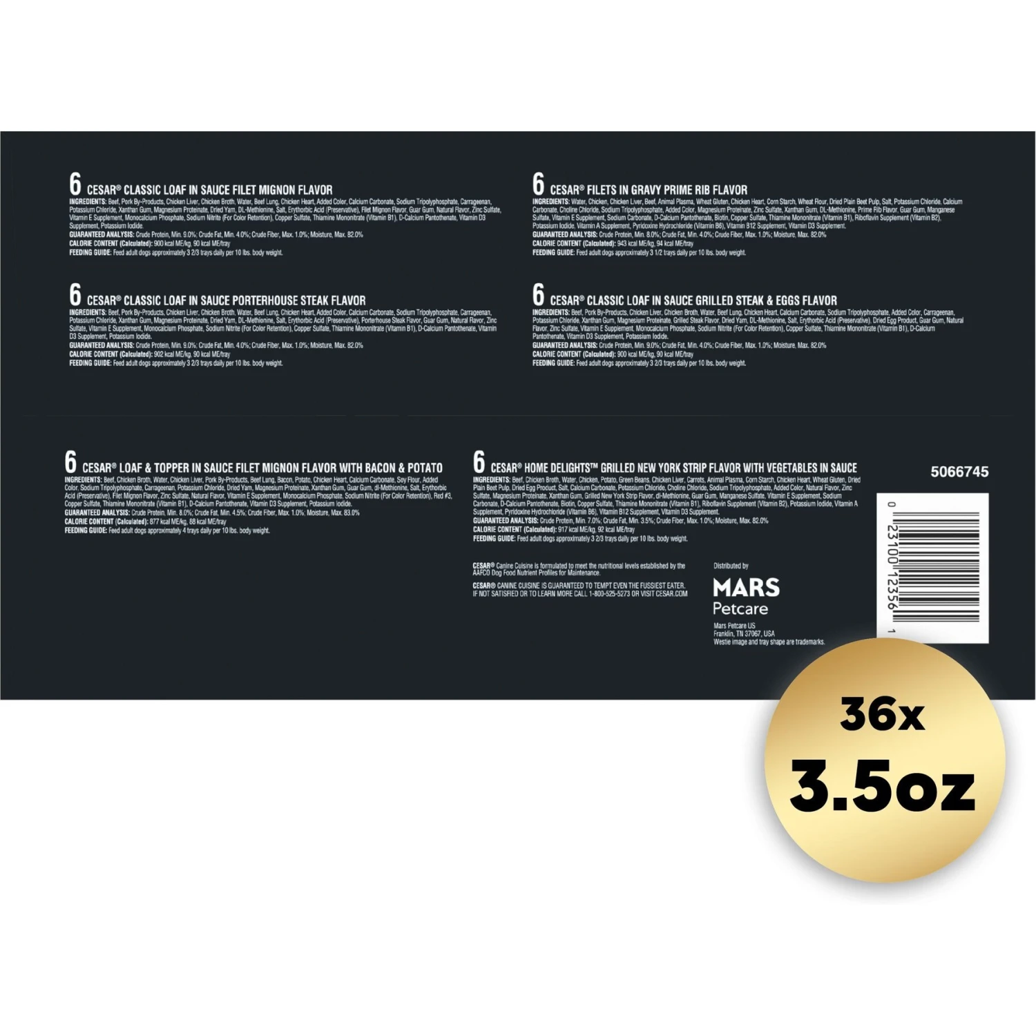 Show your canine companion your love by feeding him gourmet meals formulated to keep him happy and healthy. The Cesar Wet Dog Food Steak Lovers Variety Pack features six delicious recipes made with real meat. They’re crafted in the USA using fine ingredients from around the world, and contain no fillers, artificial flavors, or grains (although trace amounts may be present due to cross-contact during manufacturing). Plus, each gourmet soft dog food is served in a convenient tray with an easy, peel-away seal. Thanks to Cesar, you can give your best bud hearty meals that he’ll love and love you for! This variety pack includes the following recipes—Filet Mignon Flavor, Porterhouse Steak Flavor, Filet Mignon Flavor with Bacon & Potato, Prime Rib Flavor, Grilled Steak & Eggs Flavor, and Grilled New York Strip Flavor with Vegetables in Sauce.