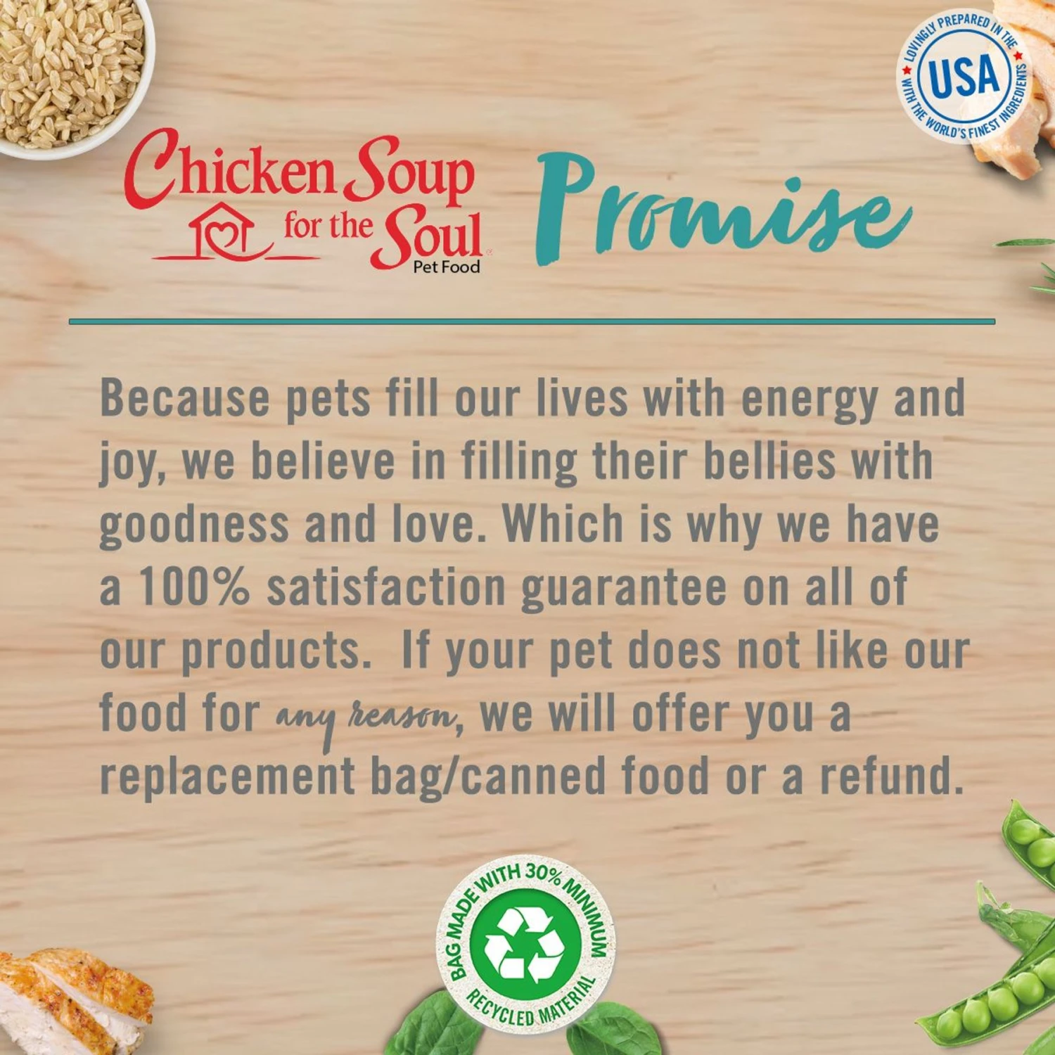 Keep your older pooch mobile and healthy with Chicken Soup Small Bites Mature Dog – Chicken, Turkey & Brown Rice Recipe! Featuring real chicken and turkey as the first and second ingredient, this su-paw scrumptious small kibble packs a big flavor. Made with glucosamine and chondroitin to support joint health, your senior furry friend can maintain optimal mobility while walking and playing. Superfoods, including blueberries, spinach and cranberries boost the immune system, omega-3 and -6 fatty acids aid healthy skin and a shiny, sleek coat while L-carnitine helps transform fat into energy. Created with chicory root for the prebiotic fiber that aids your furry friend’s digestion, this paw-some recipe contains no by-product meals, corn, wheat, soy, artificial coloring, flavoring or preservatives.