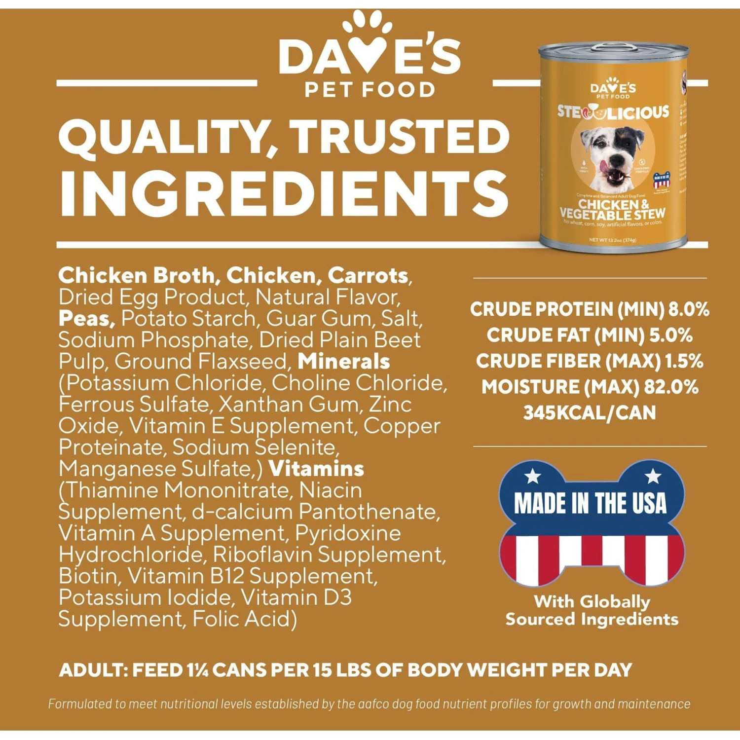 Bring the real food flavor and quality your dog loves to mealtime with the Dave’s Pet Food Grain-Free Chicken & Vegetable Cuts in Gravy Canned Dog Food. Made with no grain, carrageenan, artificial flavors or colors, and enhanced with health-promoting vitamins and minerals, it provides a deliciously balanced diet for your pup―nothing more and nothing less! Your hungry pal will run to the food bowl thanks to the natural recipe that includes real chicken, carrots, and peas, while you can feel good about giving him a wholesome, grain-free and tasty dish. It’s perfect to use as a complete meal on its own or as a lip-smacking kibble topper for picky pups.