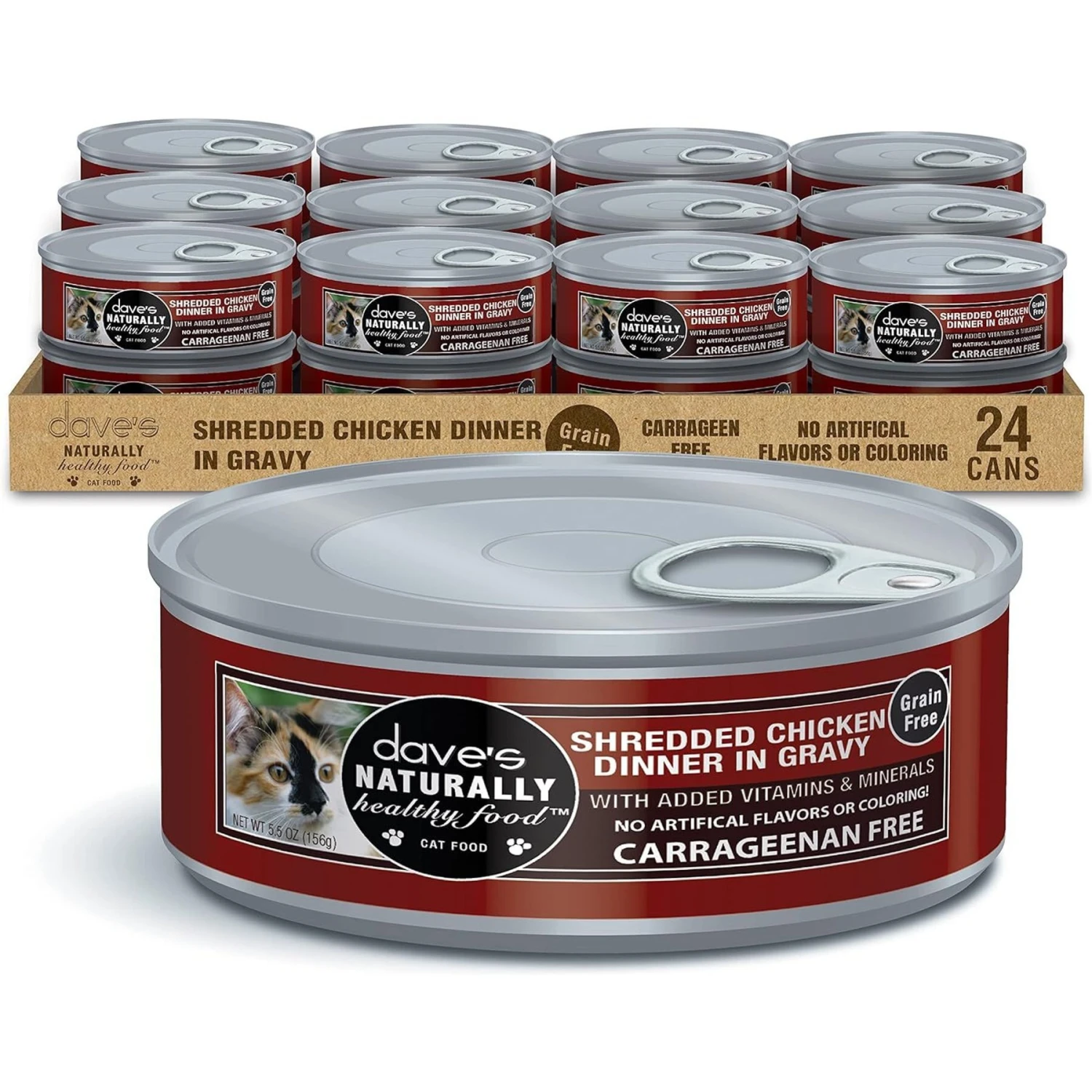 Give your kitty the high-protein nutrition he needs to thrive with Dave’s Pet Food Naturally Healthy Grain-Free Shredded Chicken Dinner in Gravy Canned Cat Food. Purr-fect for poultry lovers, it provides plenty of protein to fuel all those adventures, with chicken broth and chicken as the top ingredients. Every juicy bite is loaded with wholesome omegas for a lustrous coat, plus vitamins, minerals and essential taurine to help your pal look and feel his best. With no grains, wheat, gluten or anything artificial, even kitties with sensitivities can dive into their bowl.