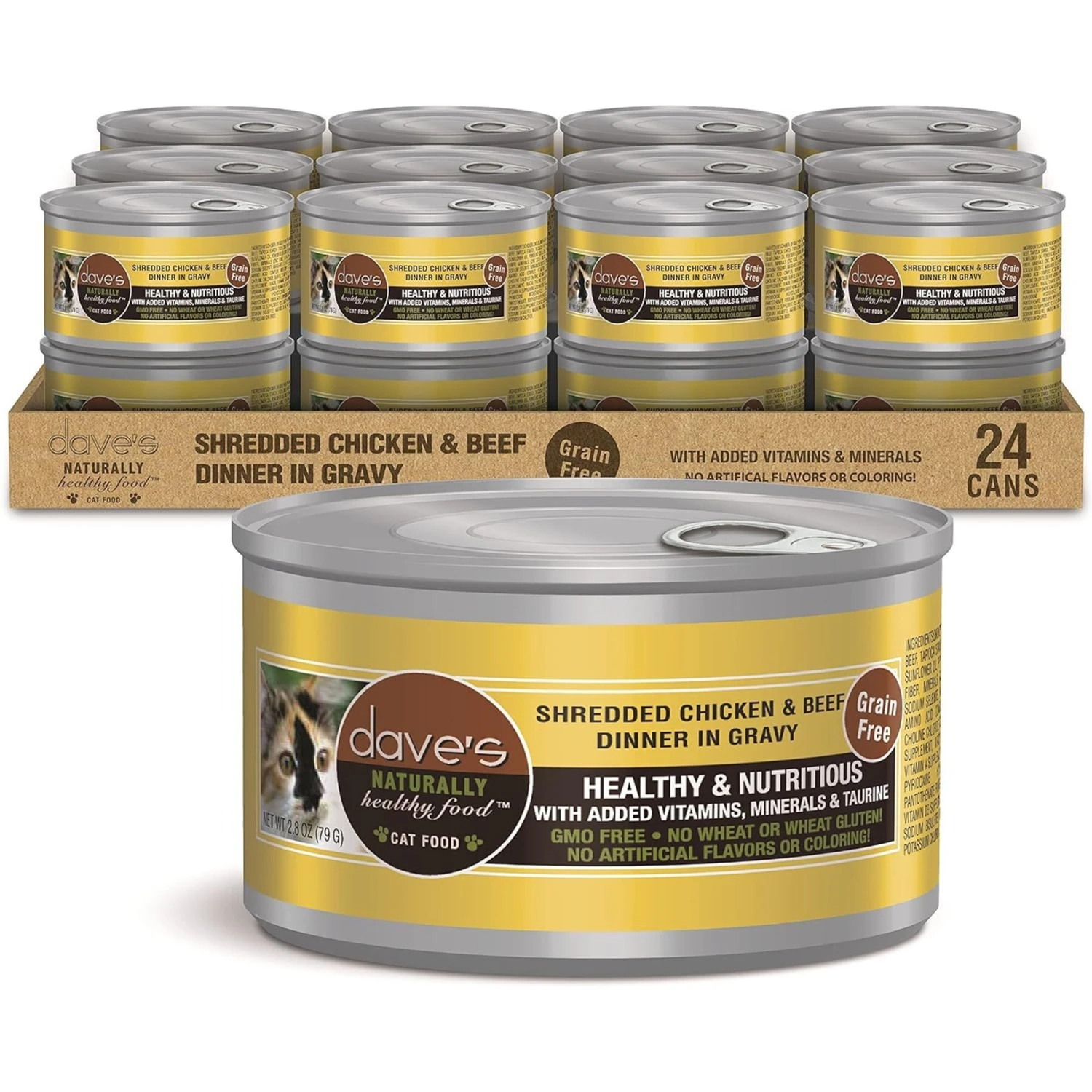 Treat your finicky feline to a momentous meal with Dave’s Pet Food Shredded Chicken & Beef Dinner in Gravy Recipe Wet Cat Food. This drool-worthy dinner is made with wholesome, tasty ingredients that you and your cat can agree on—including real chicken, beef, pumpkin and chicken broth. Added vitamins, minerals and taurine—including essential vitamins B12 and D3—create a balanced meal that supports your kitty’s well-being from nose to tail. This grain-free formula offers your obligate carnivore all of the delicious nutrition she craves. Contains no GMOs, wheat, wheat gluten, artificial flavors or coloring.