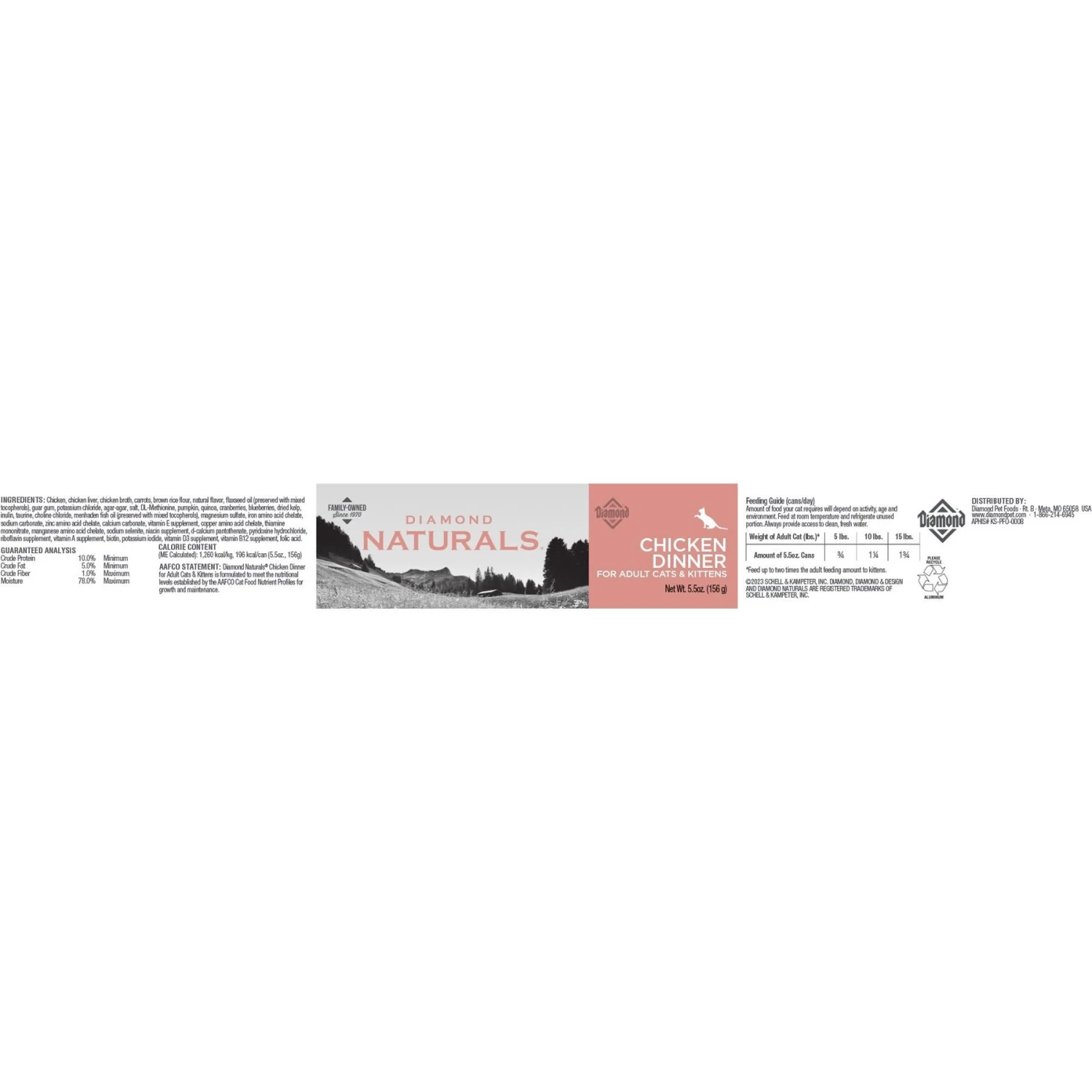 Your kitty deserves nutrition he can thrive on, so fill his bowl with the Diamond Naturals Chicken Dinner Adult & Kitten Canned Cat Food. With high-quality, delicious chicken as the first ingredient, it provides plenty of protein to help support lean, active muscles. Made with a holistic approach to pet health, it’s also loaded with field veggies and superfoods for powerful antioxidants, vitamins and minerals for overall well-being, and moisture for essential hydration in cats of all sizes and ages. With real meat and whole-food ingredients in each tasty bite, it’s the flavor and nourishment felines love—and you can feed it as a complete meal on its own or as a topper or mix-in for kibble.