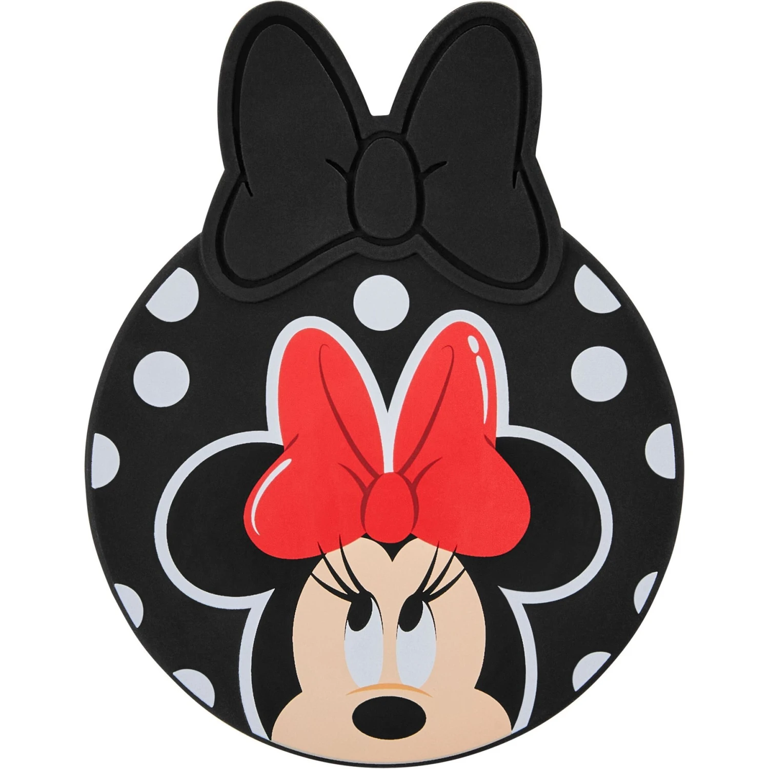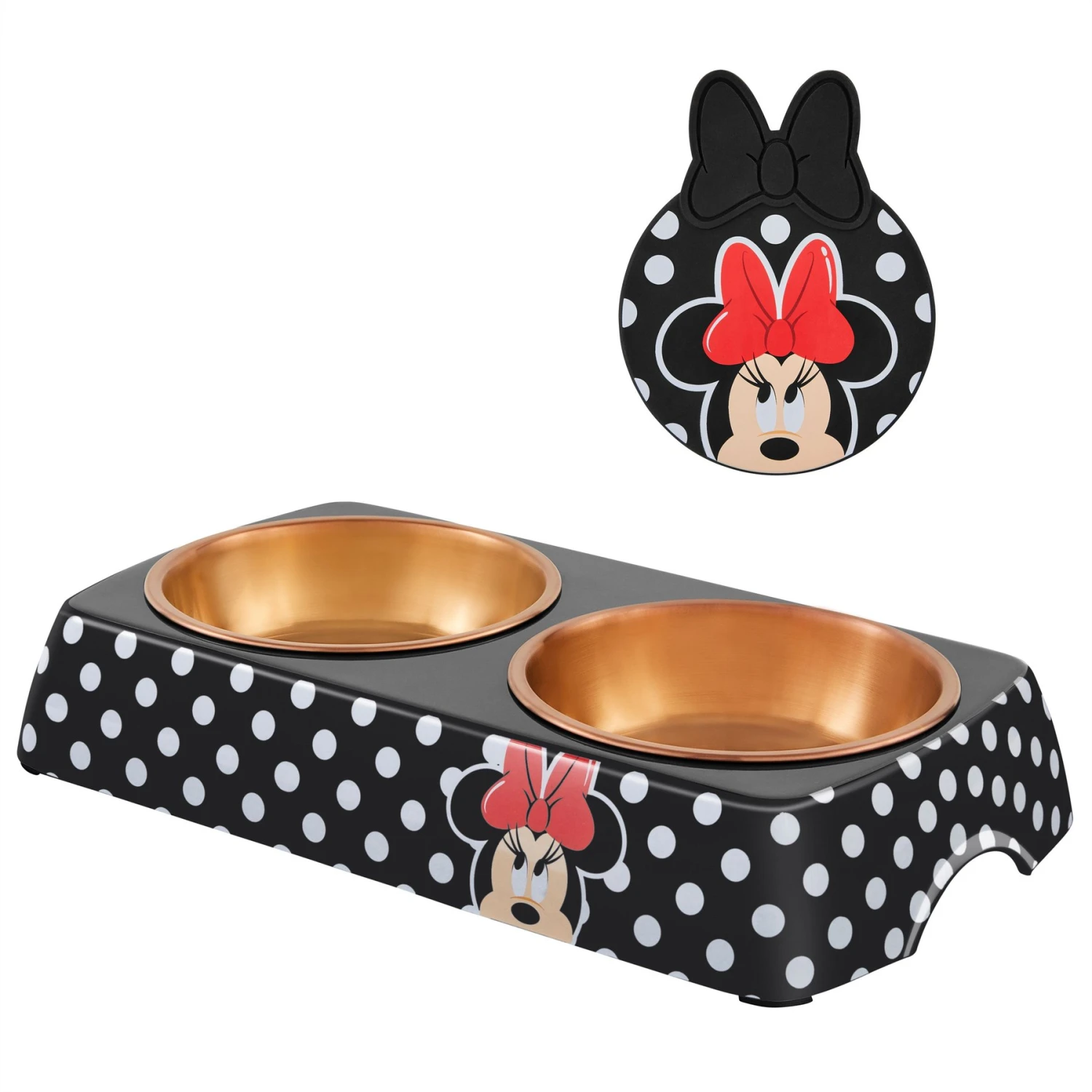 - This Disney Minnie Mouse melamine base comes in black, is covered in white polka dots and has Minnie’s face on the front for extra cuteness. Matching treat jar also available.