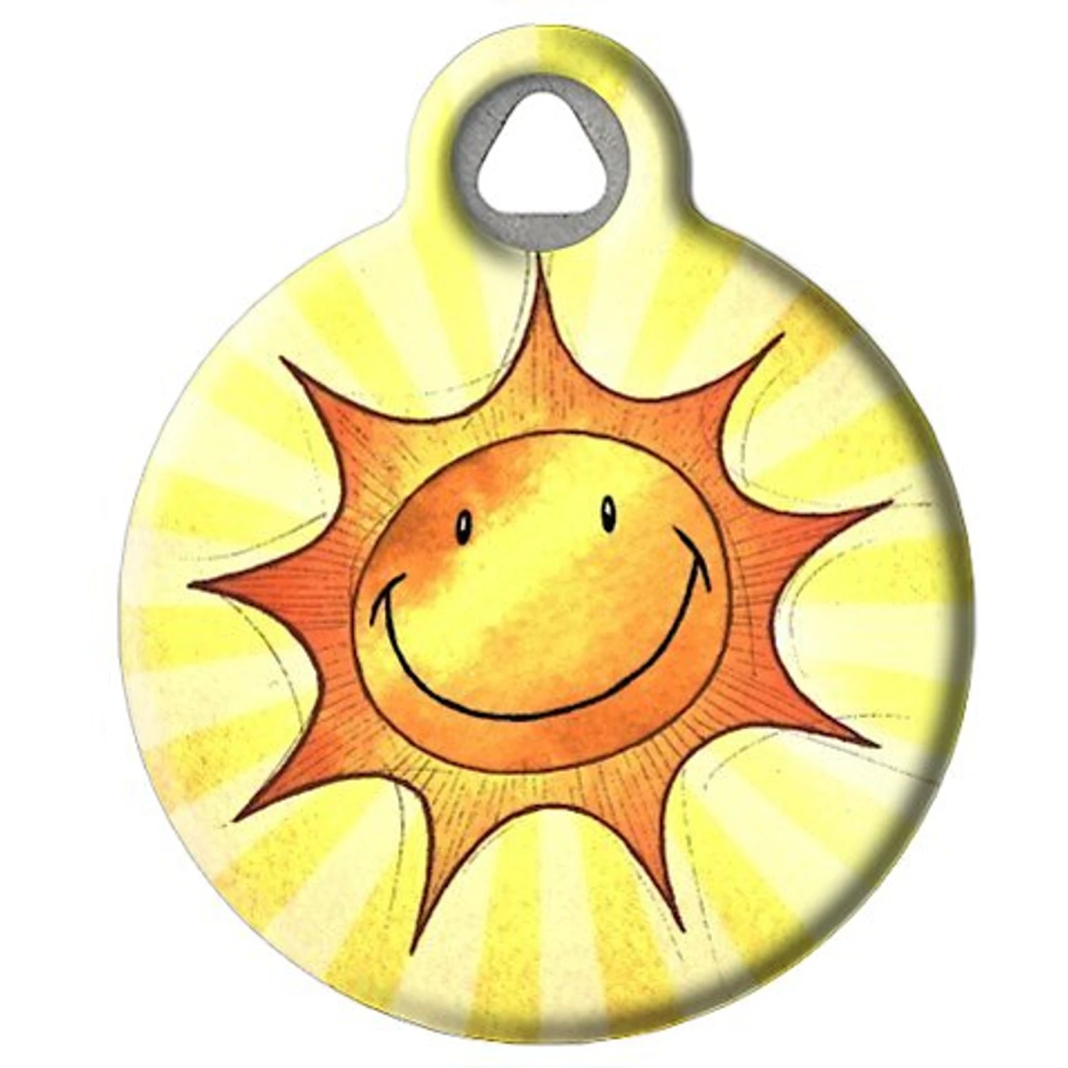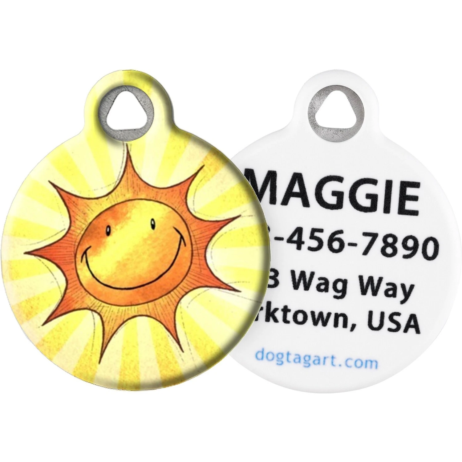 Ensure that your sidekick is always smiling with the Dog Tag Art Sun Smile Dog & Cat ID Tag. This personalized pet ID tag is designed for long-lasting durability with high-quality, recycled stainless steel construction. It is permanently infused with a unique “Sun Smile” design using a protective, polymer coating that minimizes noise while resisting wear and breakage. This full-color dog tag is customizable with up to four lines of text, with each line being up to 16 characters long. Add your furry buddy’s name, phone number, email address or other important information to make sure he always gets home safe!