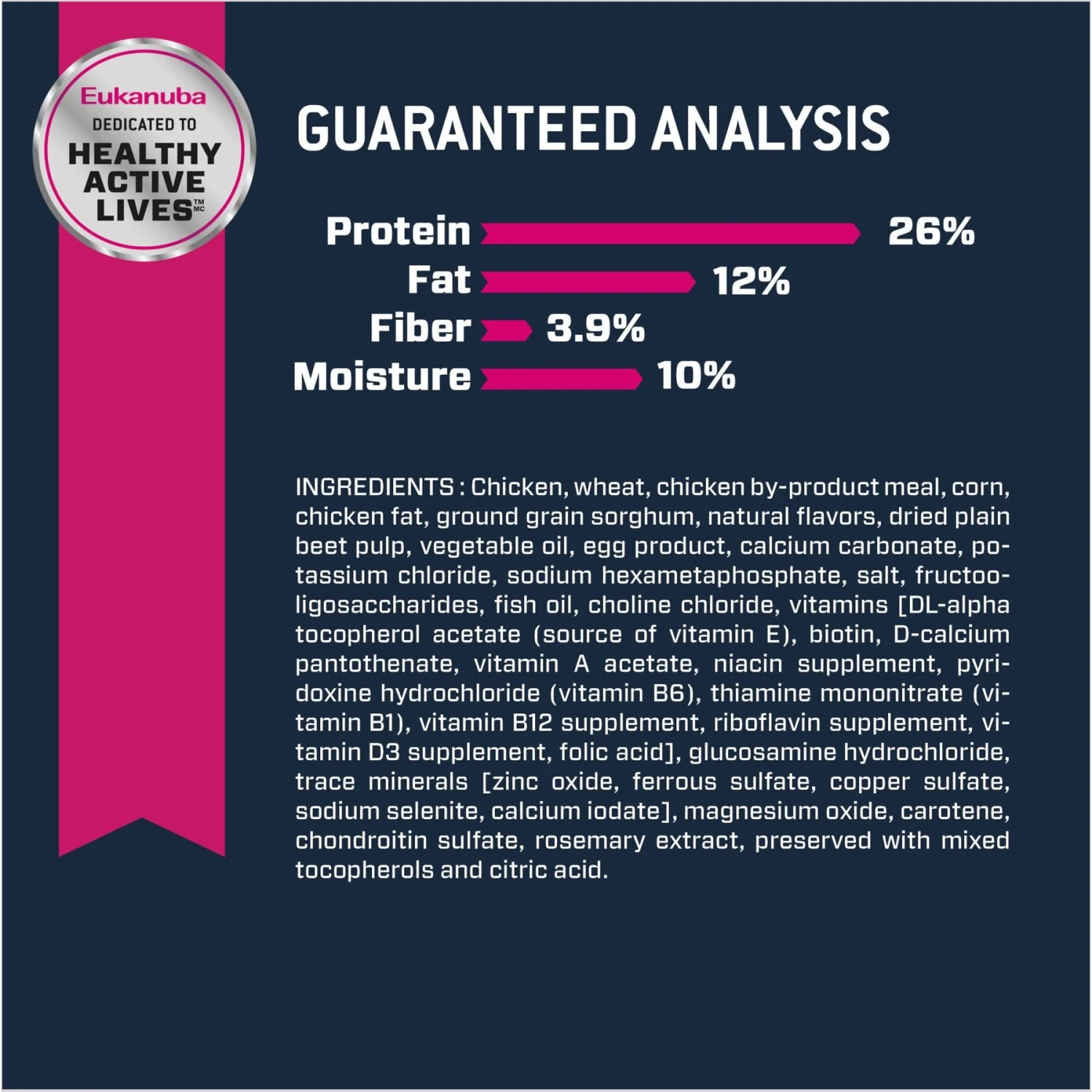 Your big dog is up for anything, from running to hiking to fetching, and it’ll take more than age to slow him down. Power his active lifestyle with Eukanuba Senior Large Breed Dry Dog Food, a diet created specifically for your dog’s body, mind, and energy. High-quality chicken is always the first ingredient, because your lively senior deserves high-quality protein. Help keep your senior dog’s joints and muscles limber with glucosamine and chondroitin sulfate, and help him stay sharp with DHA and antioxidants to support healthy brain function. The large dog food is formulated with optimal amounts of fats and carbohydrates to help maintain your older dog’s energy levels. Eukanuba 3D DentaDefense supports dog dental care by reducing tartar buildup to keep his teeth and gums healthy. This senior dog food diet also provides immune system support to help strengthen your dog’s natural defenses. Mix it with his favorite wet food for the perfect complement to your active dog’s diet. Your big dog has a big appetite and even bigger dreams, so feed him Eukanuba Senior Large Breed Dry Dog Food and make his golden years the best adventure yet.