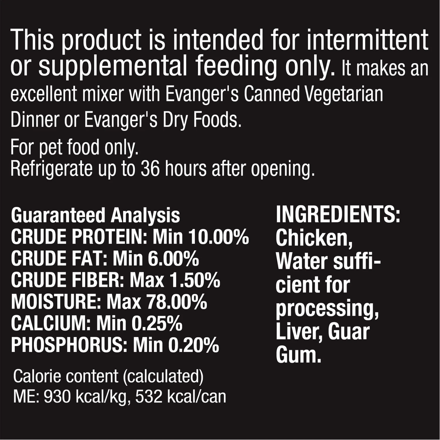 Evanger’s Chicken Canned Dog & Cat Food is grain-free and gluten-free, and makes a great complement to Evanger’s Super Premium and grain-free dry foods, or mixed with Evanger’s canned Vegetarian Dinner. It is excellent for large breed or multi-pet homes. Completely balanced, highly nutritious, great tasting innovative meals.