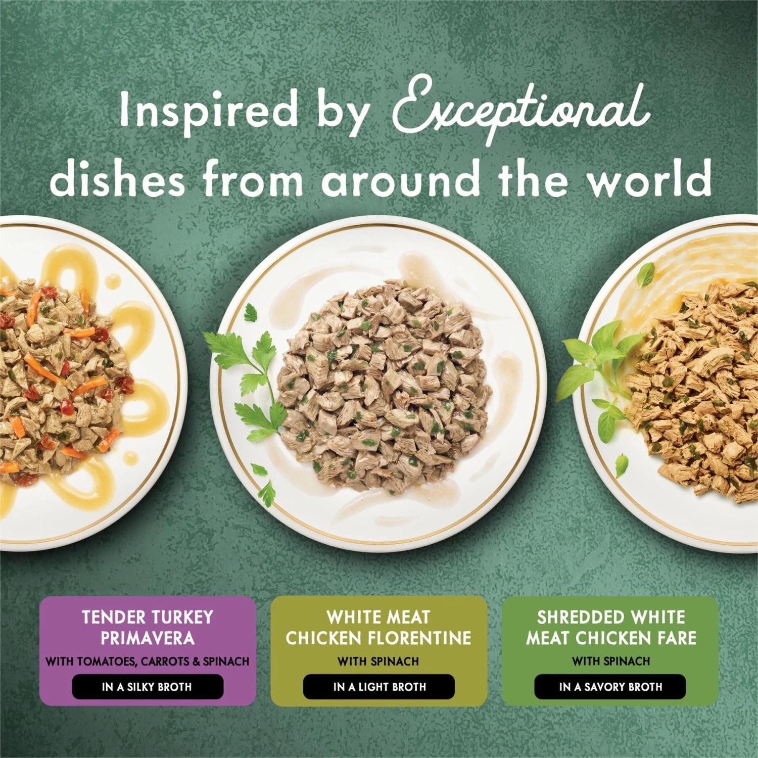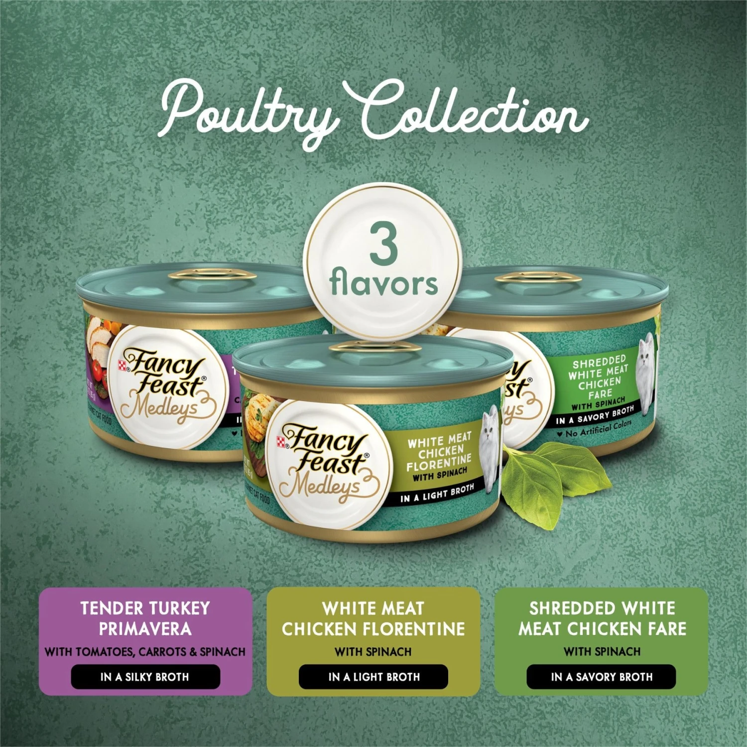 Give your kitty a meow-velous worldly mealtime experience with Purina Fancy Feast Medleys Poultry Collection Wet Cat Food Variety Pack! Inspired by poultry dishes from around the globe, this purr-fect medley offers deliciously delectable taste without any artificial preservatives. This culinary cuisine is crafted in partnership with expert chefs and cat nutritionists and made with high-quality ingredients, including grilled chicken or real turkey in gravy. Providing 100% complete, balanced nutrition, even your most purr-snickety cat will love these expertly prepared recipes.