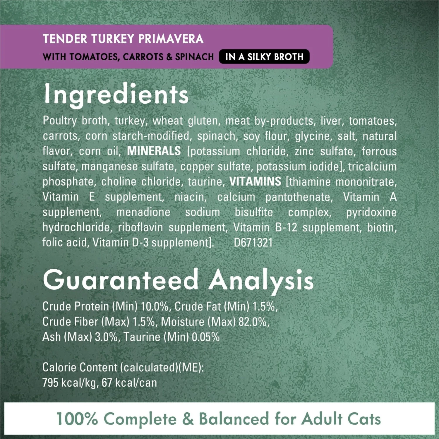 Delight your cat with this Purina Fancy Feast Medleys Cat Food Variety Pack, Medleys Primavera. This Fancy Feast canned cat food Primavera collection features White Meat Chicken Primavera with Tomatoes, Carrots and Spinach in a silky Fancy Feast broth, Tender Turkey Primavera with Tomatoes, Carrots and Spinach in a Silky broth, and Tuna Primavera with Tomatoes, Carrots and Spinach in a Silky Broth for Cats. Crafted in partnership with our expert chefs and nutritionists, each Fancy Feast Medleys recipe features combinations inspired by dishes from around the world. This 100% complete and balanced formula for adult cats without artificial colors or preservatives provides your cat with the nutrition they need. Watch your cat scamper each time you open a can of Fancy Feast cat food shreds. For cats who love meals with different flavors and textures, sample our other Fancy Feast Medleys varieties of wet food for cats.
