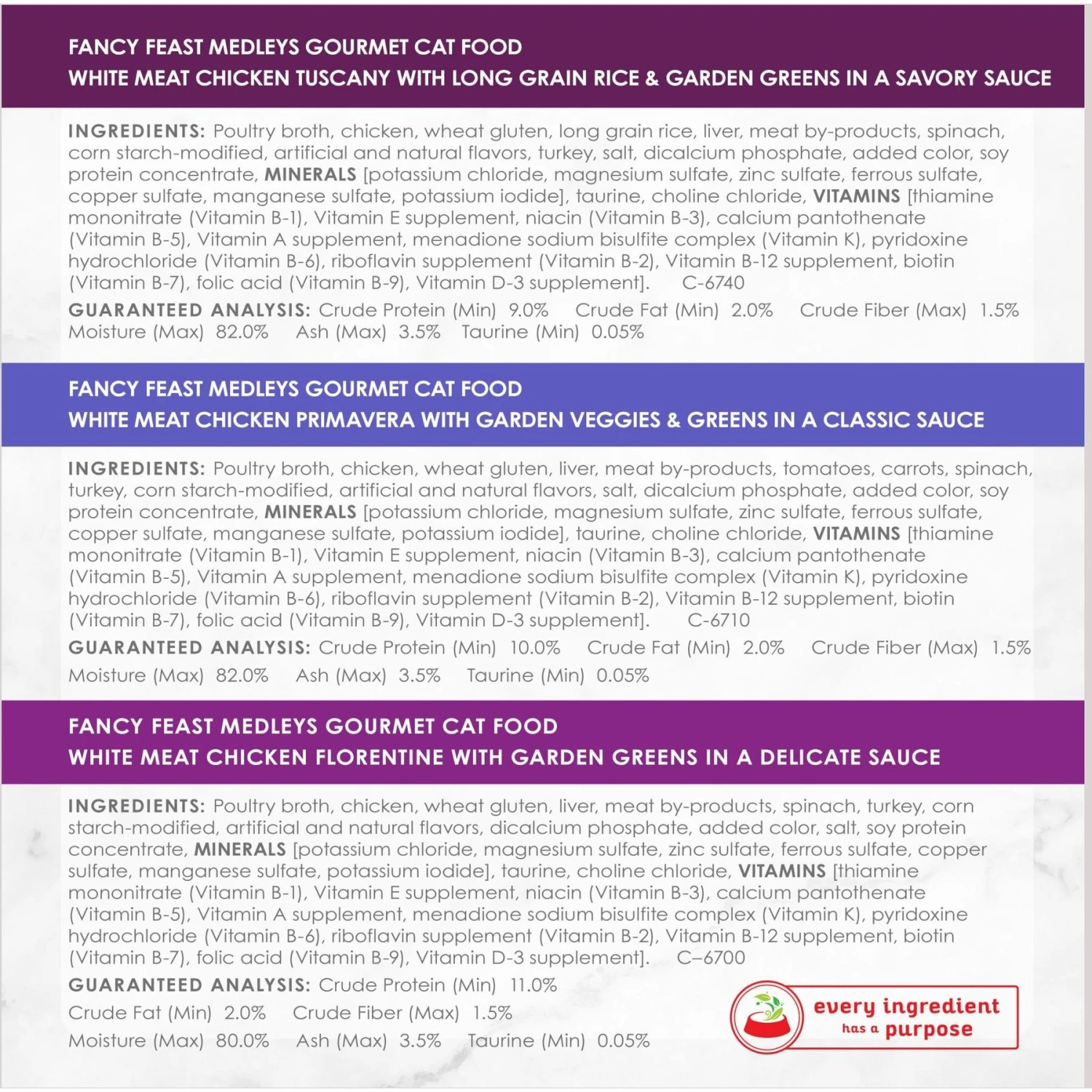Tempt your kitty’s taste buds with a collection of whisker-licking dinners! Purina Fancy Feast Wet Cat Food Variety Pack, Medleys White Meat Chicken in Sauce Collection includes bistro-inspired chicken flavors in real broth. Enhanced with vitamins, minerals, and essential taurine, these canned meals are packed with protein, antioxidants, and healthy omegas–for nose-to-tail nutrition in every bite. Plus, real broth provides moisture that supports your pal’s urinary health and helps keep him hydrated. The delectable dinners come with an easy to pull tab for the purr-fect mealtime experience.