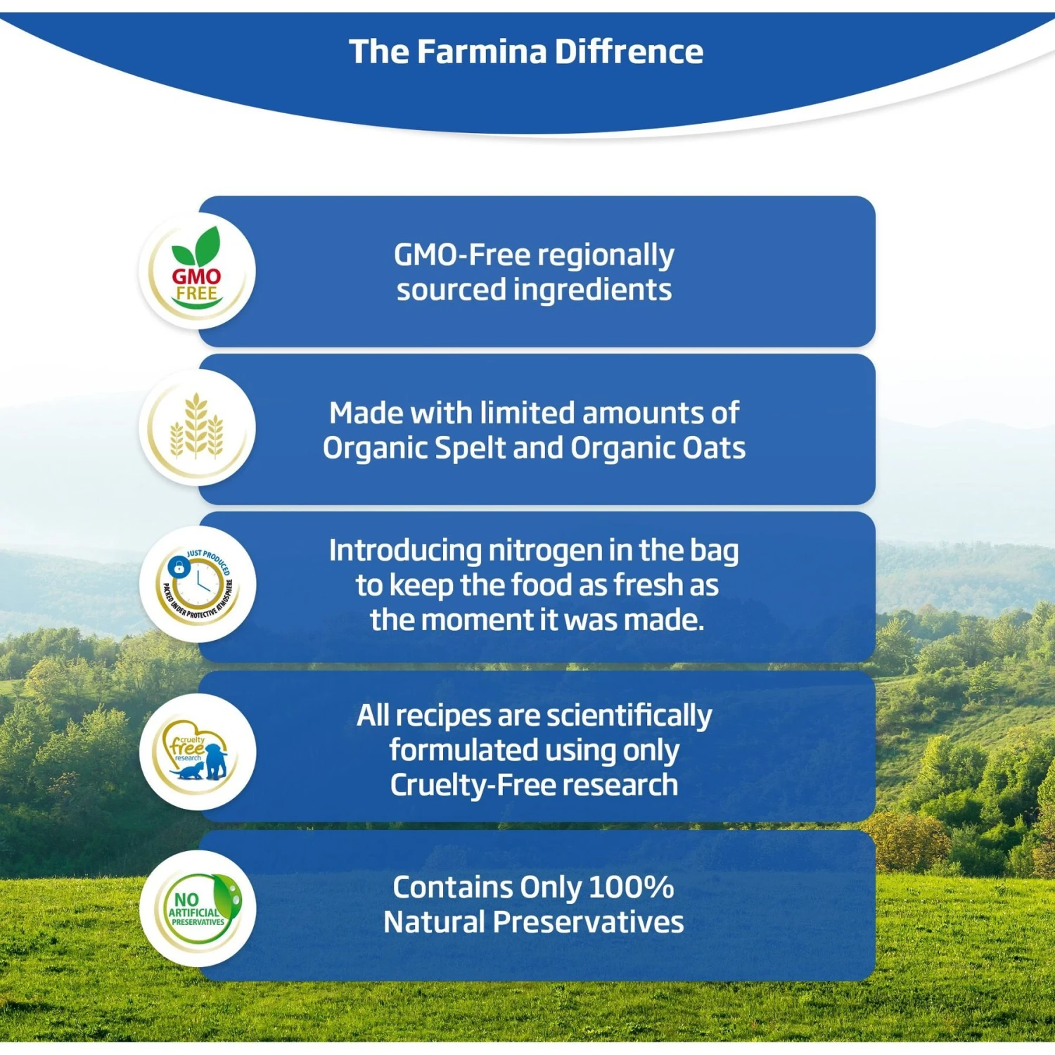 Every Farmina food is made with the best ingredients with the correct amounts of protein, fats, limited carbohydrates and advanced long life vitamins and minerals. The Natural & Delicious high protein, 20% Ancestral Grain formulas are comprised of 60% animal ingredients (pre-cooking weight), 20% organic spelt and organic oats and 20% vegetables, fruits, vitamins and minerals. Delicious Chicken & Pomegranate flavor contains no peas, legumes, meals or by-products for nutrition you can feel great about.