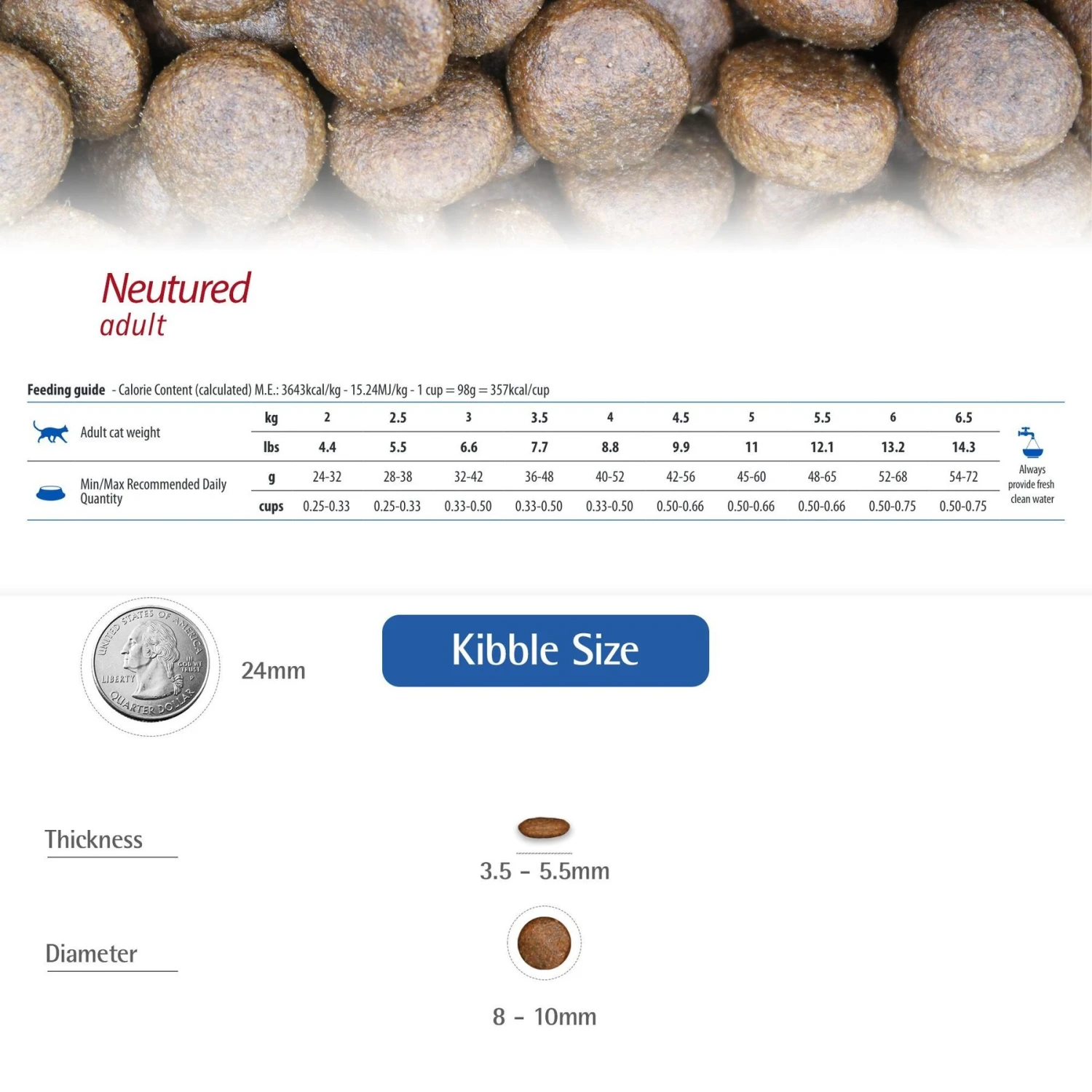 - Lower-calorie formula for neutered cats, with 94% of protein derived from animal sources.