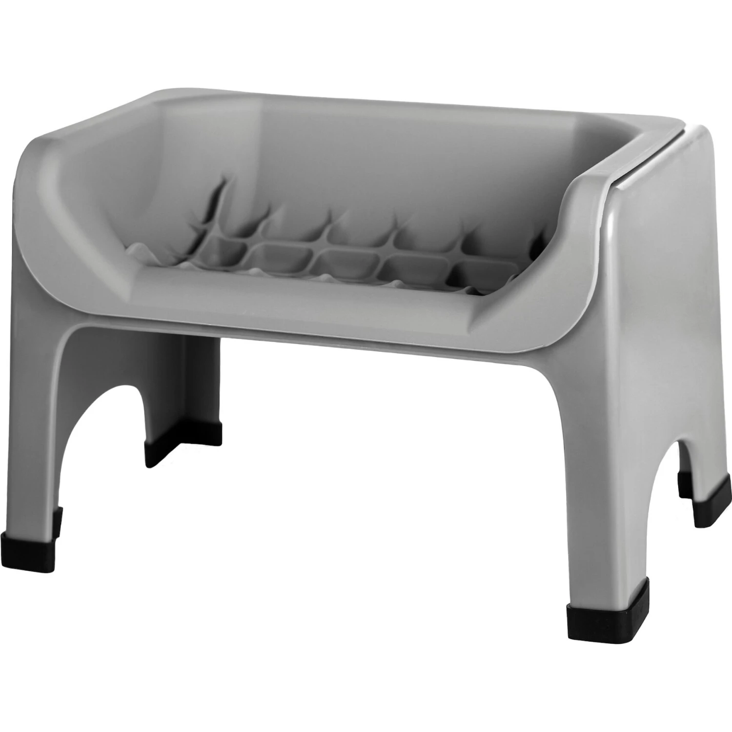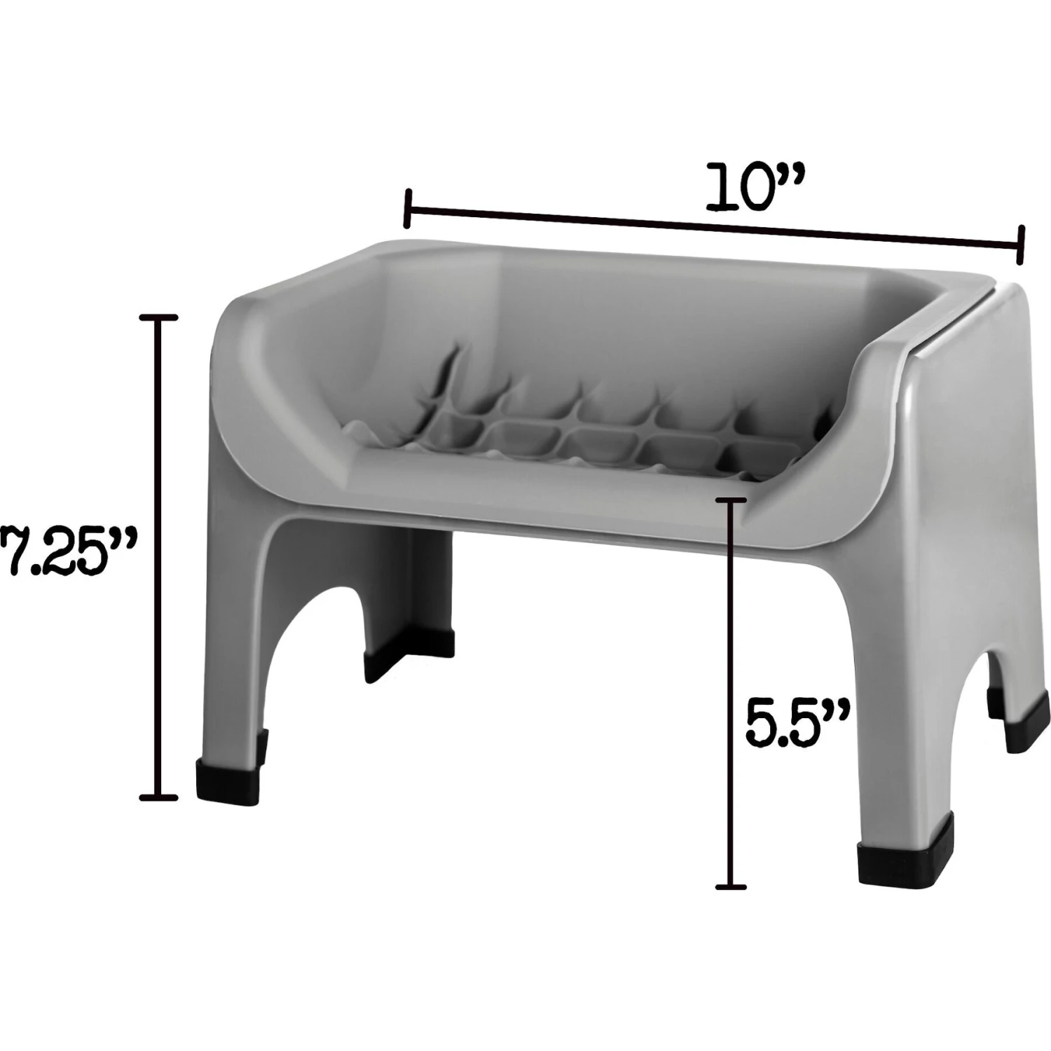 - Dishwasher-safe feeder includes non-slip feet to prevent it from sliding around on the floor, while the raised back helps prevent food from spilling.