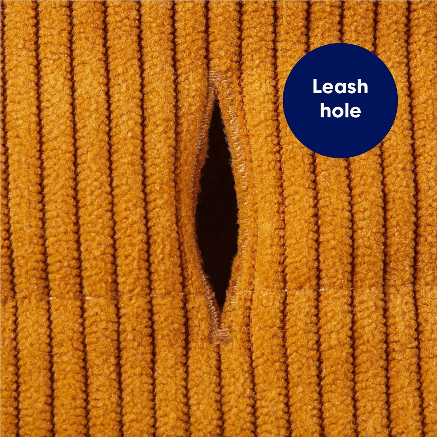 Remember to measure your pet for the perfect fit. This heavyweight corduroy coat from Frisco by Chewy piles on the perks to keep your pet as warm and comfy as possible. A polar fleece lining; elasticated armholes and adjustable hook-and-loop fastening that allow for an optimal, unrestrictive fit; and adjustable cinch points at the bottom hem and neck to trap heat in provide a line of defense from chilly weather. A snap-button at the back of the hood fastens to the back of the coat so you can attach it when it’s not in use. It can also be removed entirely if that’s easier. Either way, keeping your pet protected from cold in customizable corduroy has never looked so good.