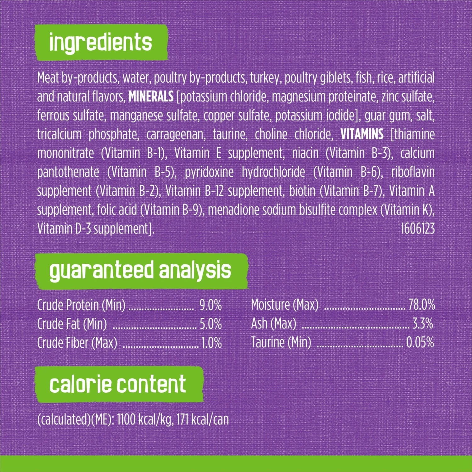 Give your pal a bowlful of kitty-approved flavor and nutrition with the Friskies Classic Pate Turkey & Giblets Dinner Canned Cat Food. This classic pate recipe features tasty and nutritious turkey and giblets, and is packed with everything your cat needs to stay looking and feeling his best, like protein, antioxidants and healthy omegas. Plus, the formula is enhanced with vitamins, minerals and essential taurine for nose-to-tail well-being in every bite. Since it’s made with real broth, it also provides moisture to help keep your pal hydrated and support urinary health. So open up the easy pull tab and turn mealtime into yum time.