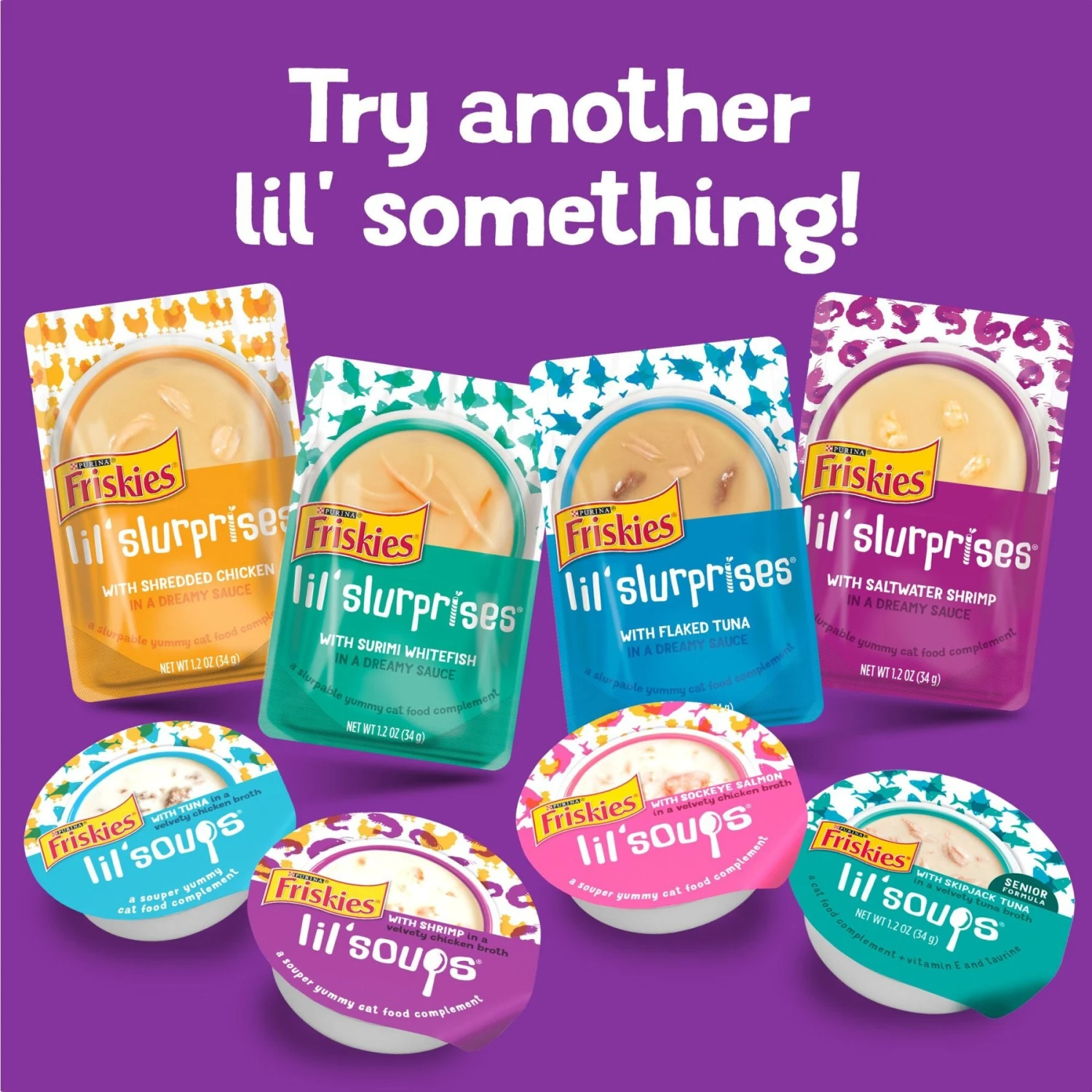 Surprise and delight your kitty with this Friskies Lil’ Gravies & Lil’ Grillers Variety Pack Wet Cat Food Complement. Your curious cat is sure to flip for the four tasty flavors and two tempting textures in this collection. They’re all conveniently packaged in pouches that are easy for you to store, open and serve! For grilled cat food chunks she can’t wait to sink her teeth into, let her try Purina Friskies Lil’ Grillers Seared Cuts selections. Or, to bring the yum-tastic taste of poultry to snack time, serve up Purina Friskies Lil’ Gravies recipes. All four flavors are soaked in a savory gravy to help support her healthy hydration. Pour these Purina Friskies wet cat food complements on top of her kibble, or use them as extra-special treats to turn ordinary days into extraordinary adventures. Either way, these Friskies variety pack cat food complements make it purr-fectly easy to satisfy her cravings with just a tear of a pouch.