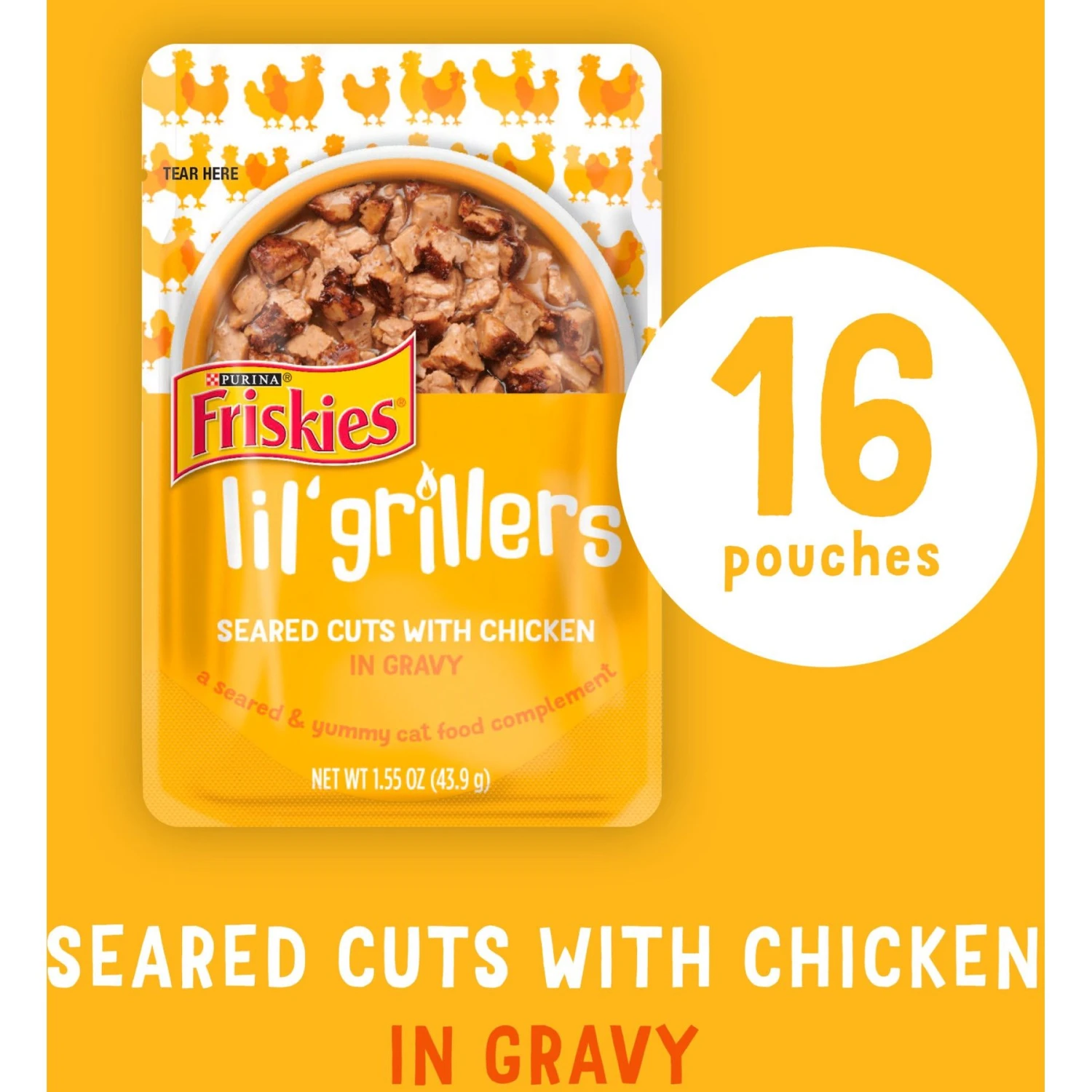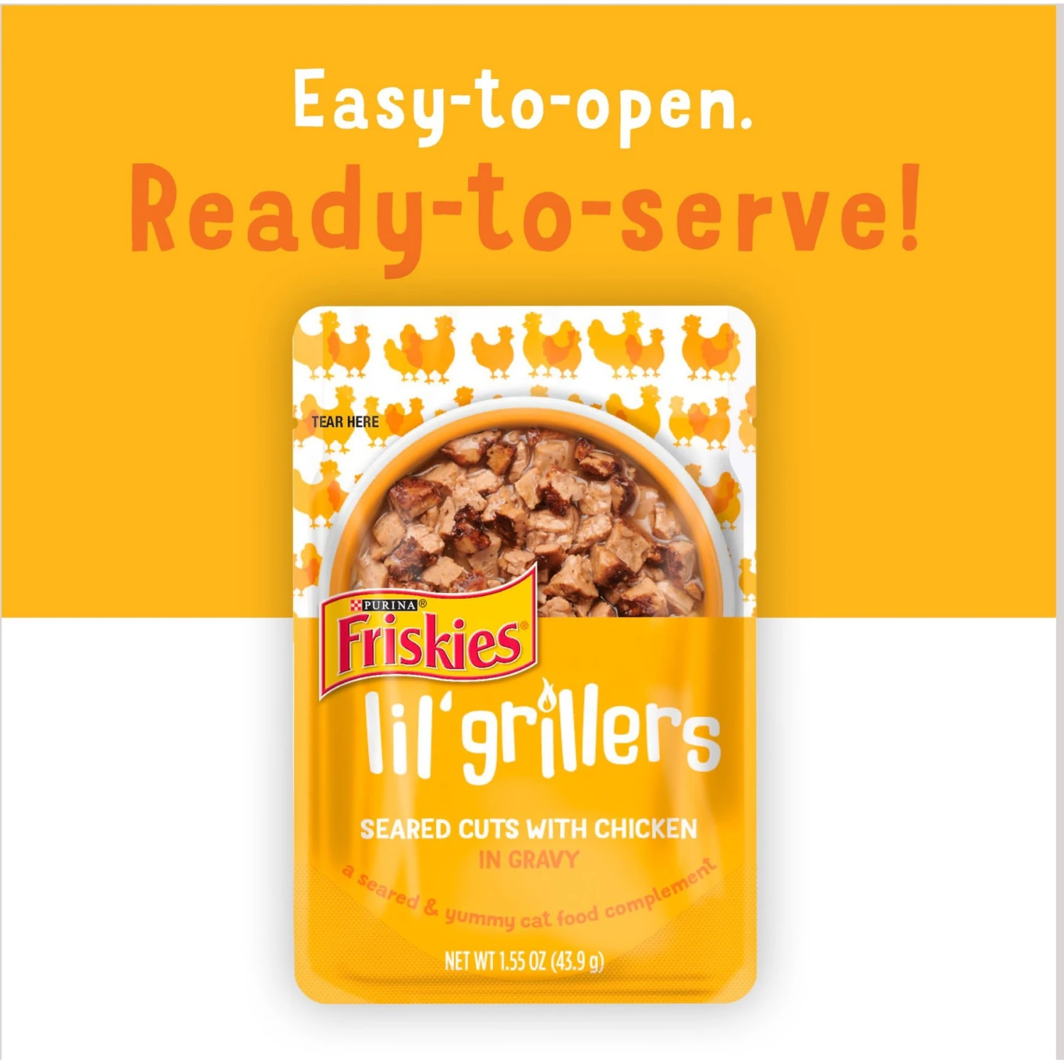 Make mealtime paw-some for your kitty with Friskies Lil’ Grillers Seared Cuts With Chicken In Gravy Wet Cat Food. This cat food complement is packed with tasty flavors for meow-worthy meals. Seared pieces of chicken are oh-so tempting, and the aroma will bring your frisky feline running. Savory rich gravy encourages kitty to lick her dish clean. This food is the purr-fect way to dress up your cat’s food or to give her an extra-special treat in between meals. A convenient pouch makes it easy to serve up this food complement at any time.