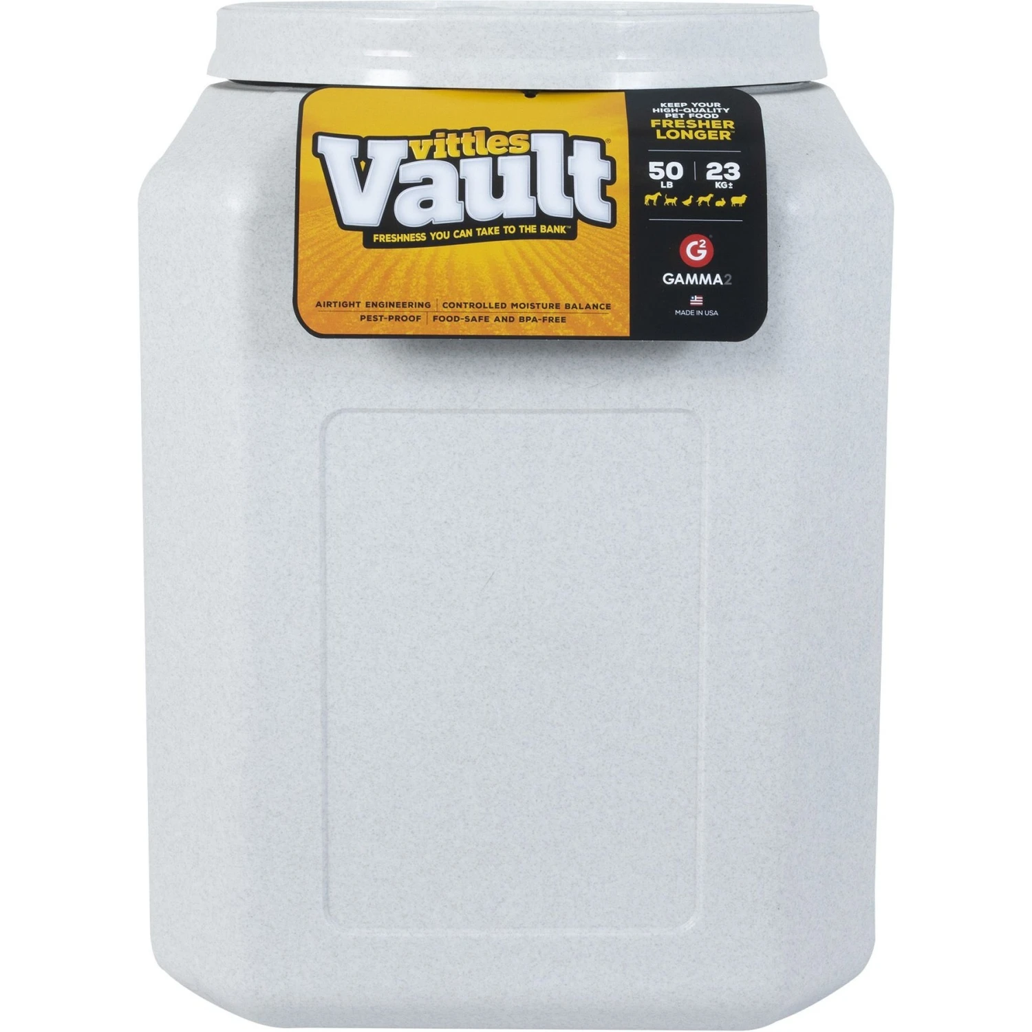 The Vittles Vault is just right for keeping your pet food fresh! Made of heavy duty, food grade plastic and with an easy opening lid, they are completely airtight to keep freshness in and pests out. Plus, the Vittles Vault features a stylish granite stone finish.