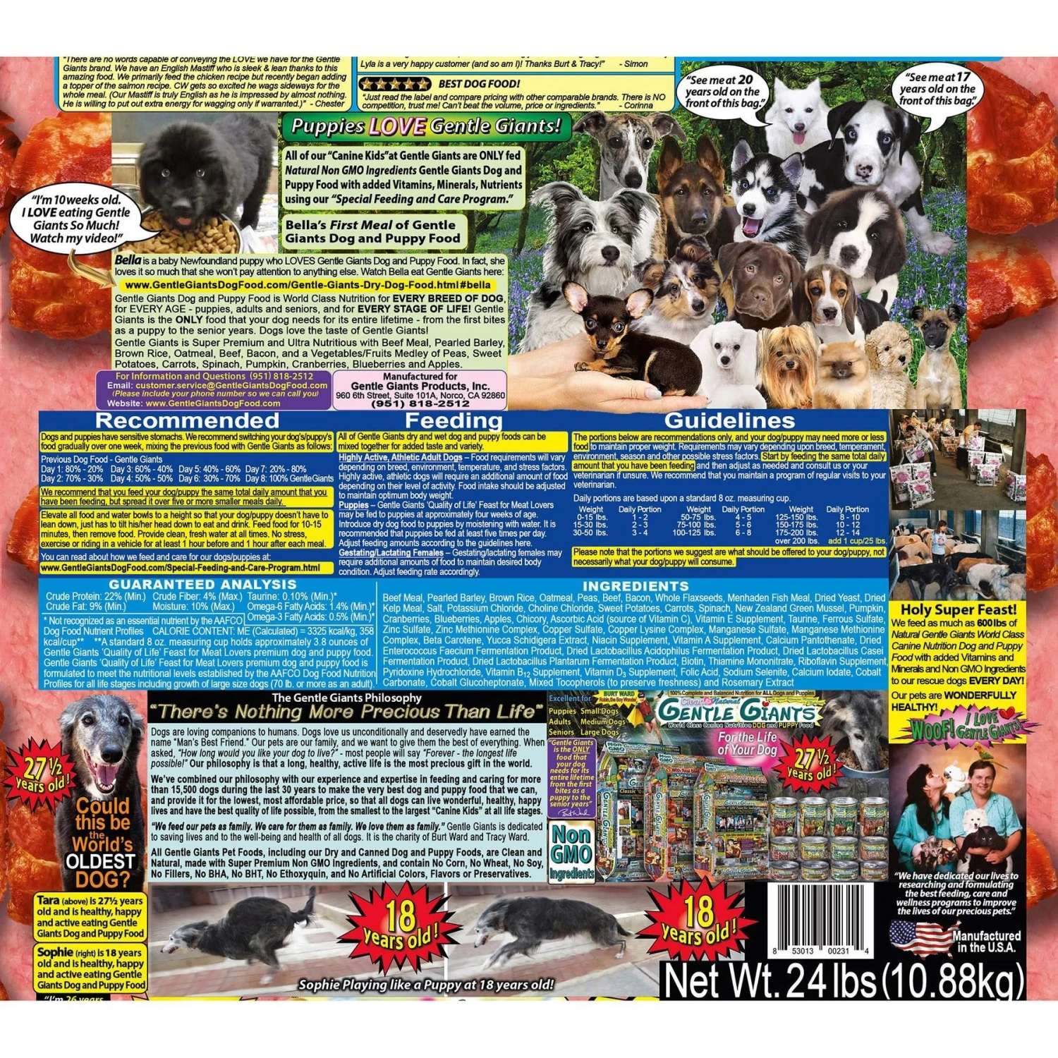 Gentle Giants with Real Beef & Real Bacon Dry Dog Food is crafted with all non-GMO super premium ingredients like real farm-raised beef and bacon. It also features other real, recognizable ingredients including brown rice, pearled barley, oatmeal, and 8 fruits and vegetables like pumpkin, blueberries, cranberries, apples, peas, sweet potatoes, carrots and spinach! And with New Zealand Green Mussels, which are naturally packed with glucosamine and chondroitin, this kibble can also help reduce inflammation, support healthy joints, and even help restore bone strength. Gentle Giants recipes are chockfull of chelated vitamins, minerals, omega-6 fatty acids, omega-3 fatty acids, prebiotics and probiotics, providing your pup with the wholesome nutrition she deserves. This kibble is suitable for dogs of all ages, from puppy to senior.