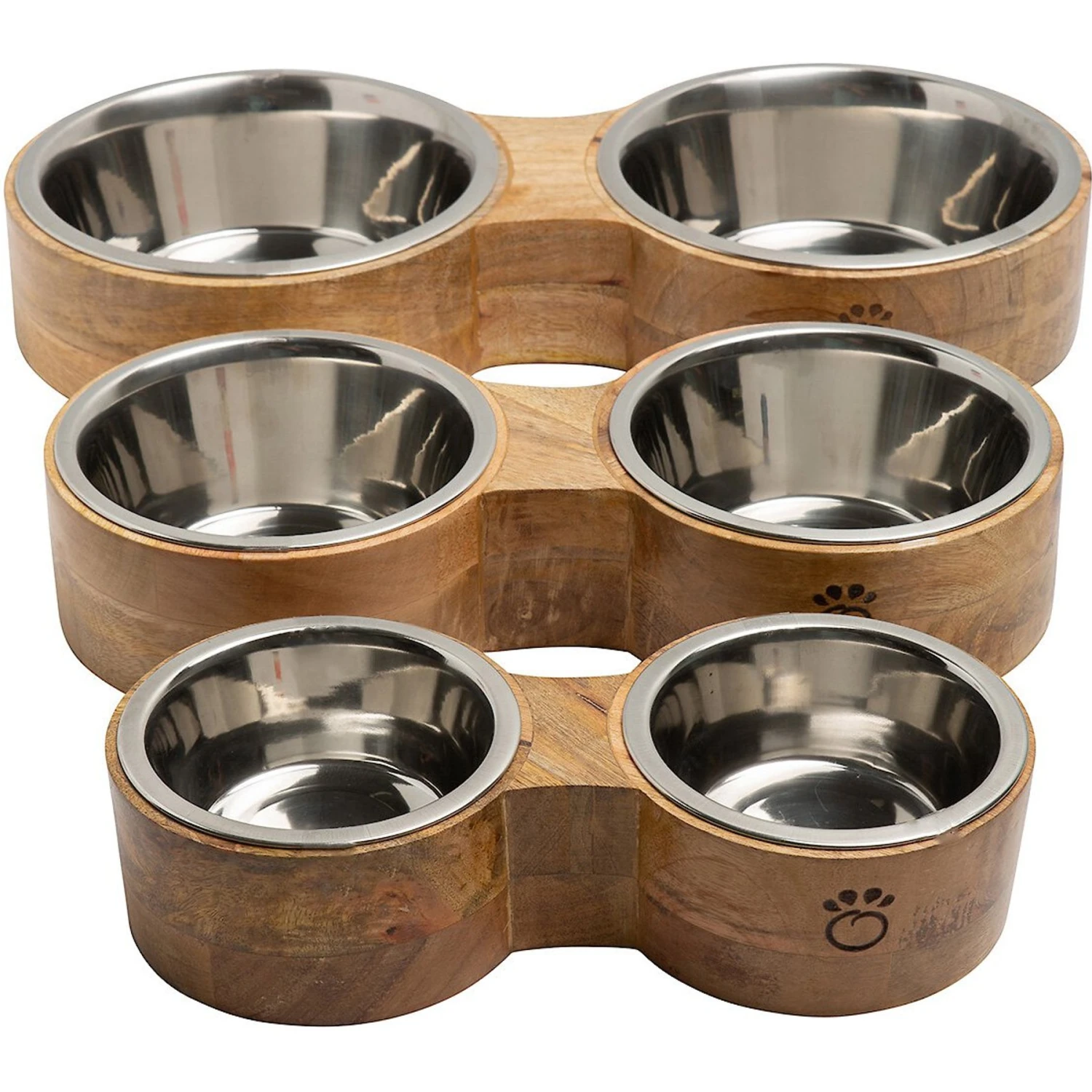 Spice up your fur-iend’s dinner time with an exotic GF Pet Figure-8 Cat & Dog Feeder. Each mango wood feeder is handcrafted in India, so no two diners are exactly alike. Made of beautiful, durable mango wood, this feeder complements virtually any home décor. The food and water dishes are not only stylish, they’re practical too—the removable, stainless-steel bowl inserts are dishwasher-safe. The bowls are paw-fect for serving dry or wet food to cats and dogs.