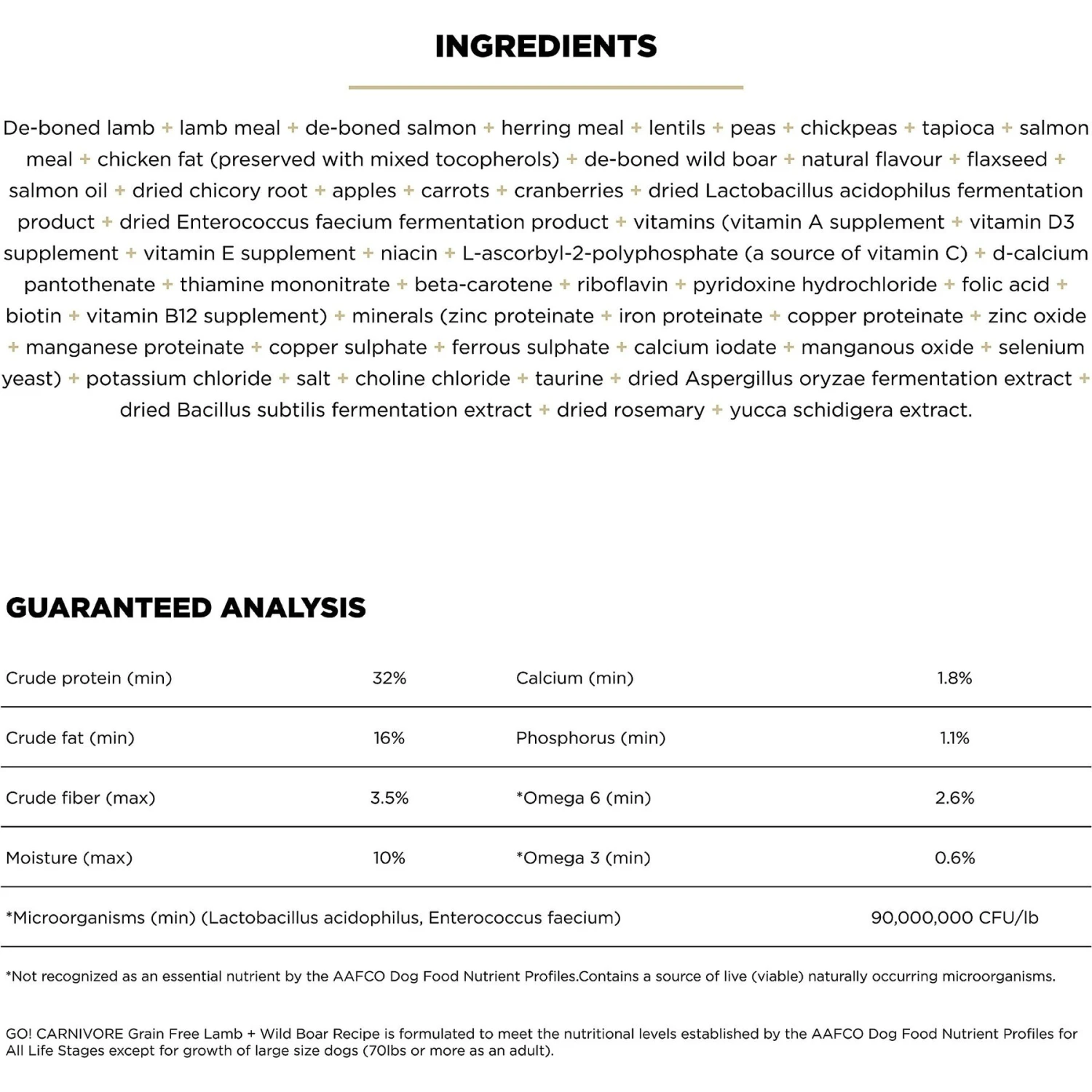 Feed your furry friend premium nutrition tail-ored to his unique dietary needs with Go! Solutions Carnivore Grain-Free Lamb + Wild Boar Recipe Dry Dog Food. Go! Solutions complete and balanced recipes are crafted with natural ingredients like wild boar, salmon, duck, lamb, turkey and chicken. This first four ingredients and 76% of the protein in this complete and balanced recipe come from real, premium-quality red meat and fish. This adult dry dog food is rich in essential amino acids to support muscle development and contains antioxidant-rich fruits and veggies to support a healthy immune system.