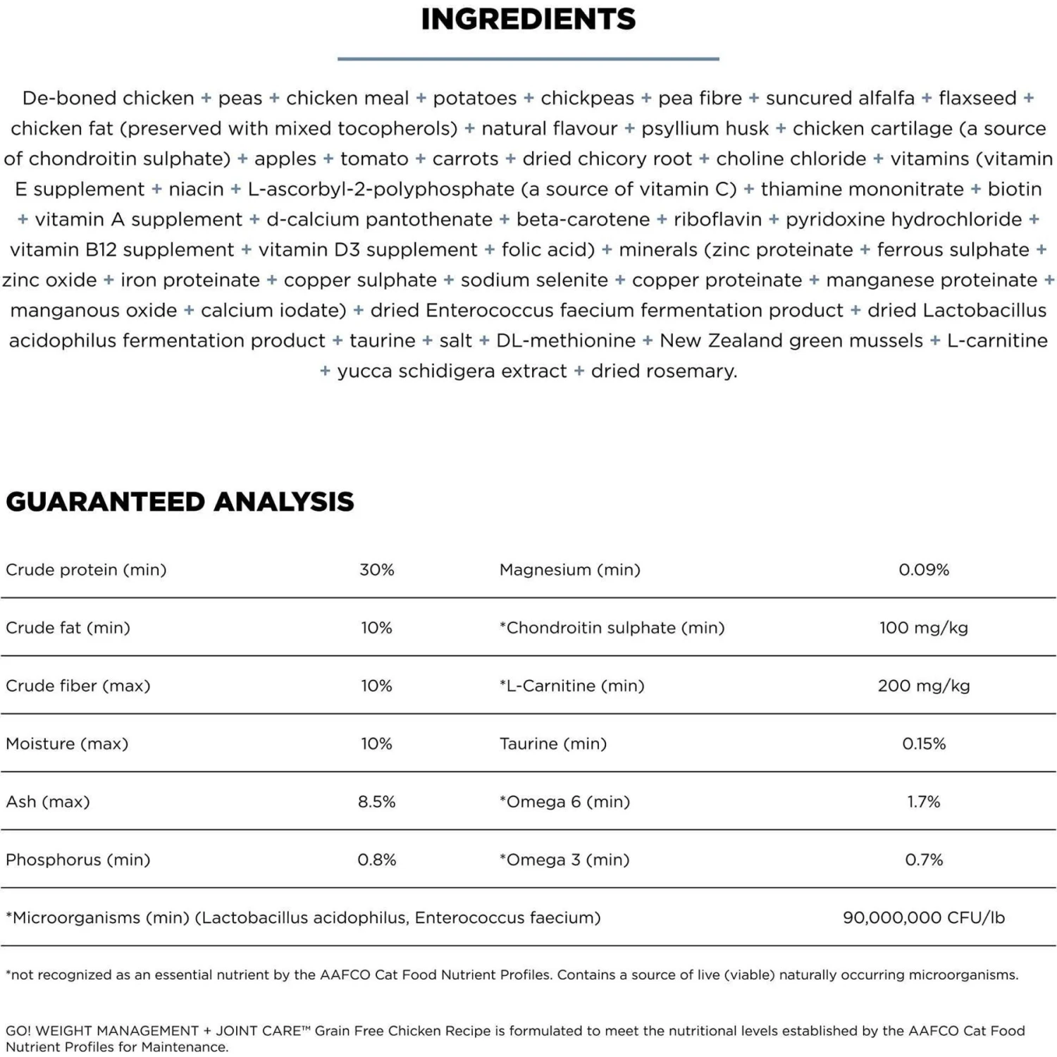 Help your kitty stay slim, trim, and full of vigor and vim with Go! Solutions Weight Management + Joint Care Grain-Free Chicken Recipe Dry Cat Food. Designed for adult cats, it’s made with a blend of premium protein, healthy fats, and functional ingredients to help maintain your best bud’s healthy weight and support his joints. Formulated with L-Carnitine and glucosamine and chondroitin to support heart health, help metabolize fat into energy and maintain healthy joints. Amino acids from top quality chicken help keep his muscles strong and lean while fiber rich psyllium husk helps him feel fuller, longer. Plus, his immune system benefits from the antioxidant properties of the fruits and veggies included in the recipe. How purr-fect!