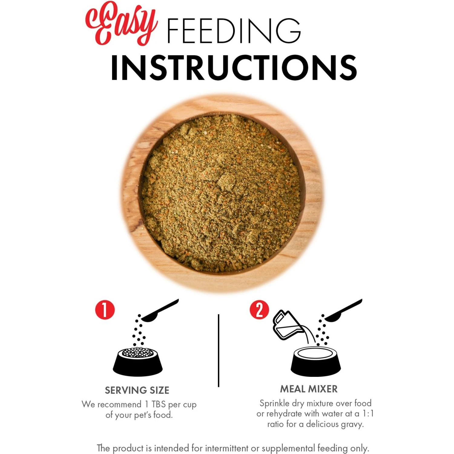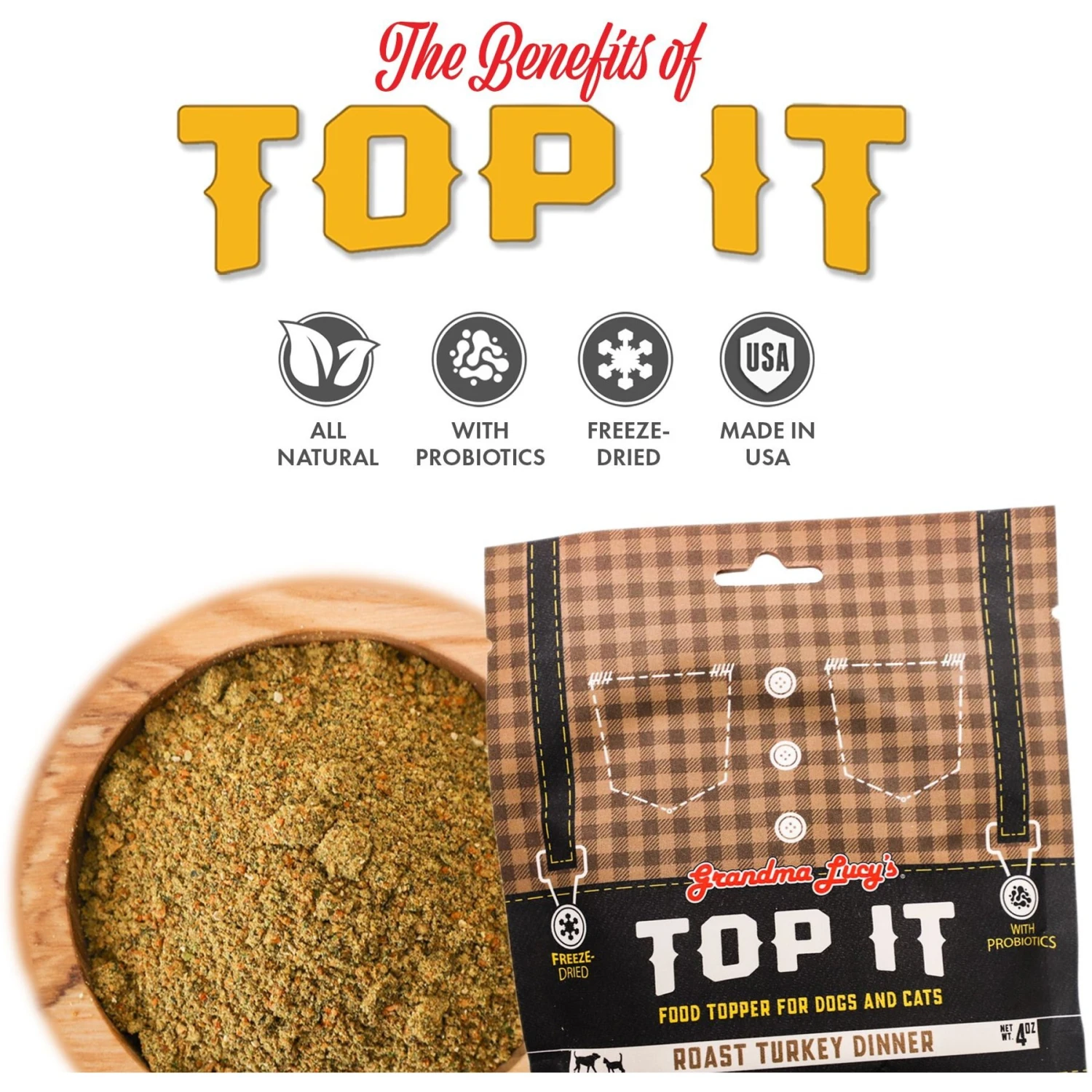 Invite your canine companion to the table with Grandma Lucy’s Top It Turkey Dinner Grain-Free Dry Dog & Cat Food Topping. Designed to fortify your doggy’s diet, this nutrient-packed topper is ideal to add to his food bowl. Filled with whole, superfood ingredients, Top It provides your pet with a nutritional boost, added hydration, and a big helping of fun during meal time! Packed with protein, this food topper will allow your pal to dine like it’s dinner at grandma’s.